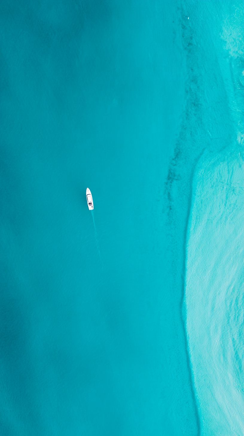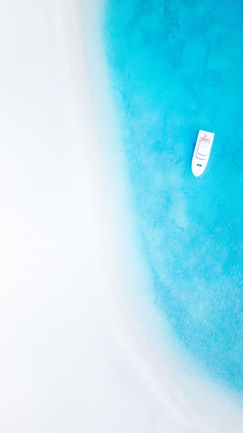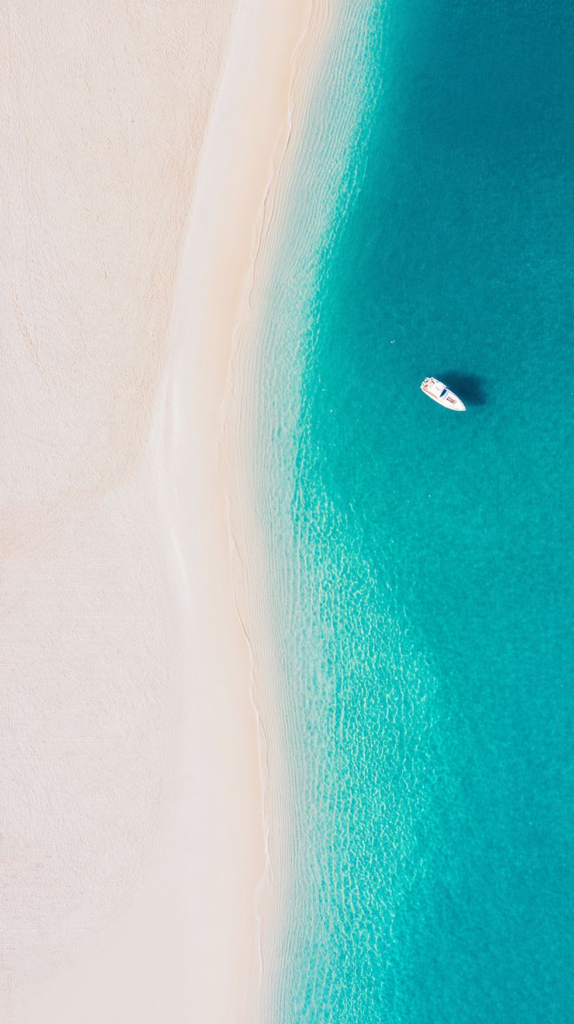 Mobile Wallpaper Download :minimalist modern wall art, vast turquoise ocean as flat negative space, small white yacht on the side, abstract minimalist composition, refined old money aesthetic, coastal luxury design, white sand