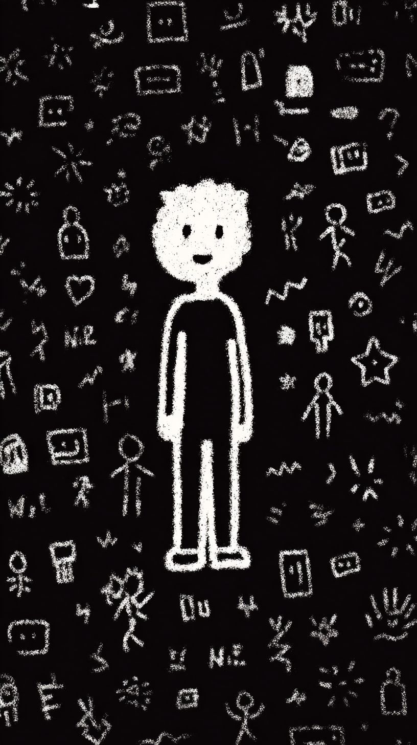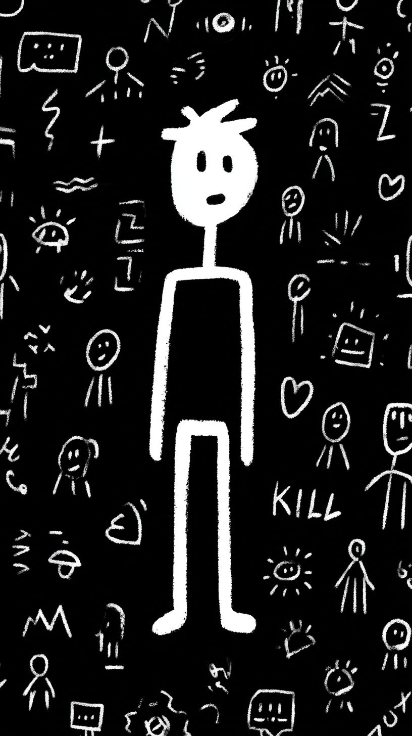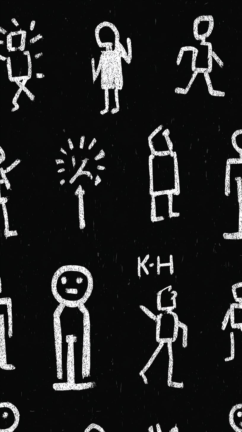Mobile Wallpaper Download :Black background, white line drawings of a large stick figure in the style of Keith Haring, cartoon, simple, minimalistic, full-page pattern.