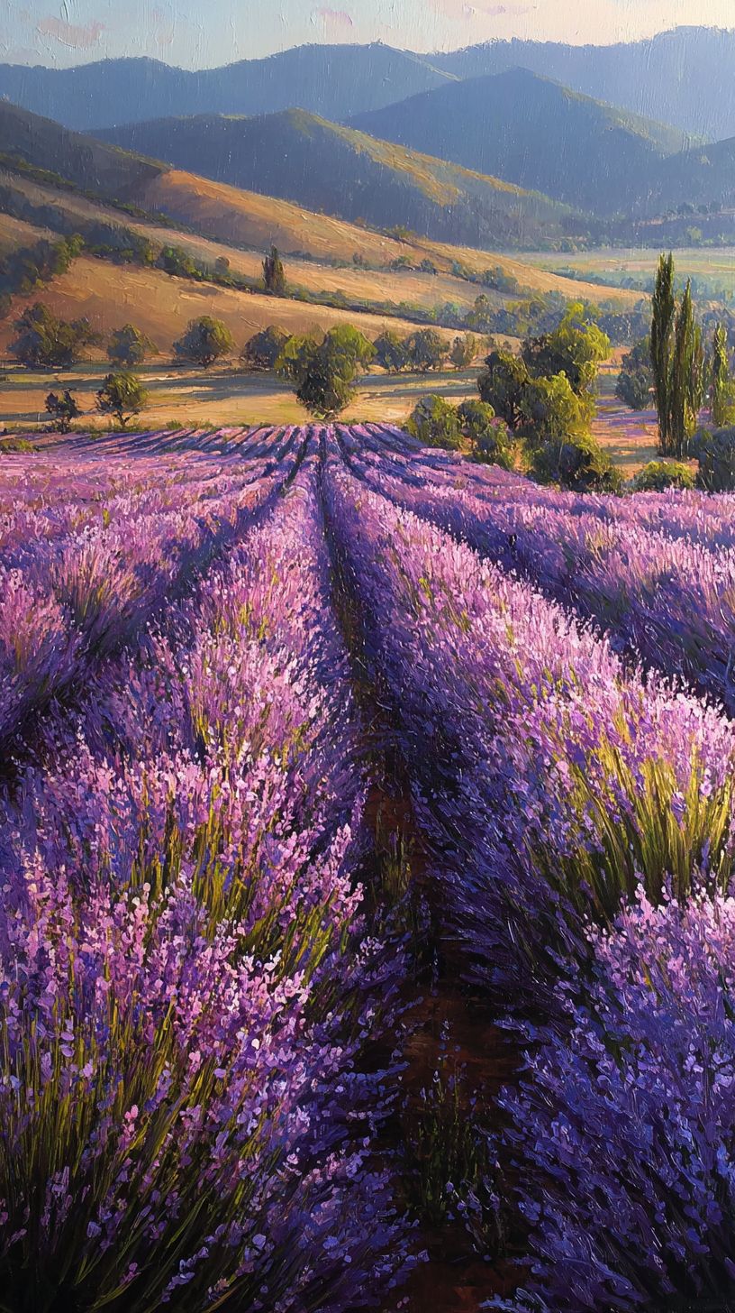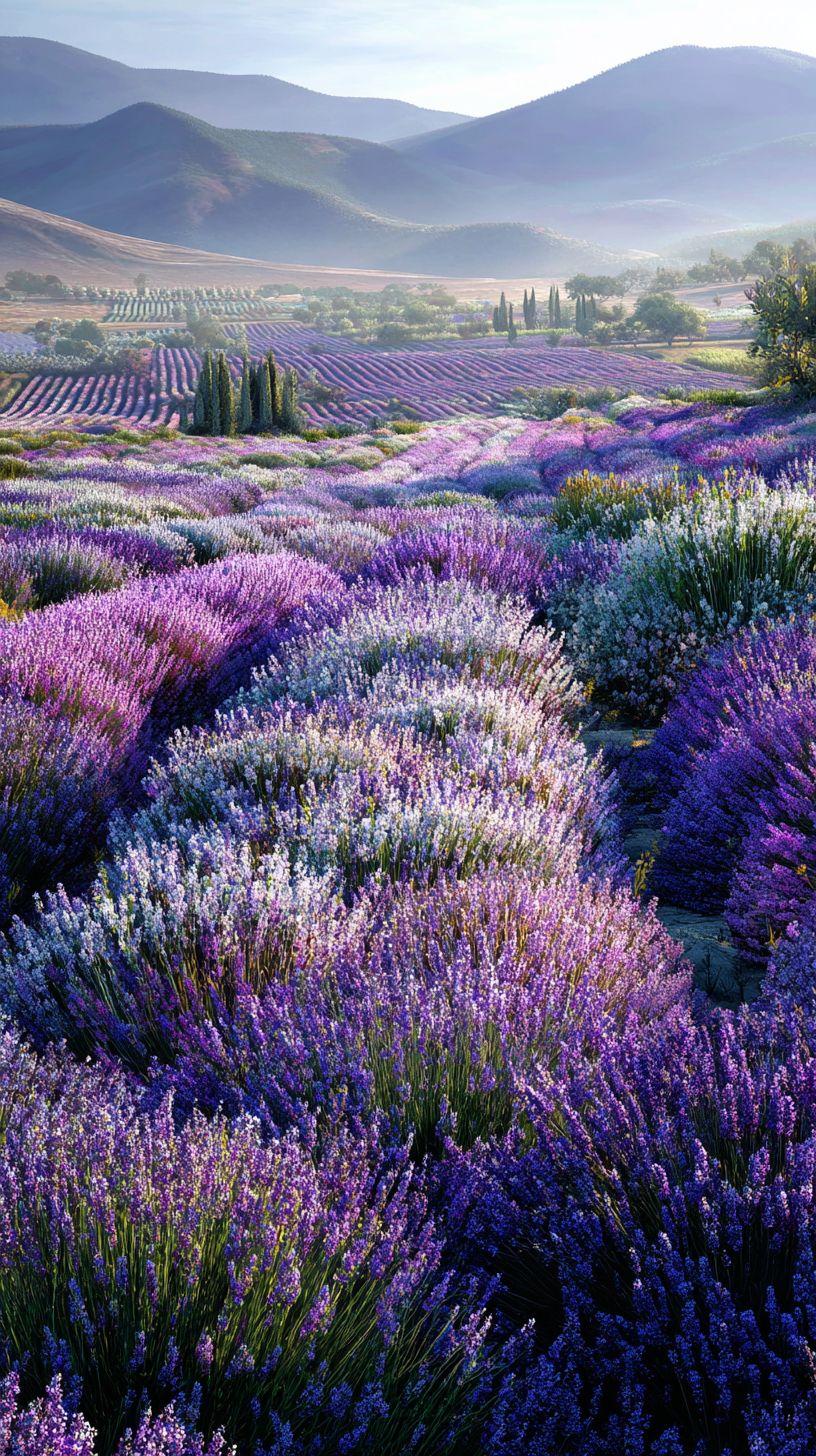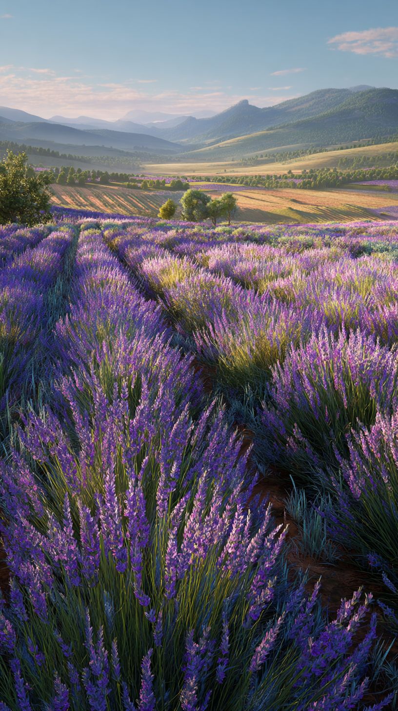 Mobile Wallpaper Download :A lush Provençal meadow filled with fragrant purple lavender, rows of blooming stalks, distant rolling hills, soft morning dew glistening on petals, golden sunlight filtering through, intricate floral patterns, serene and peaceful.
