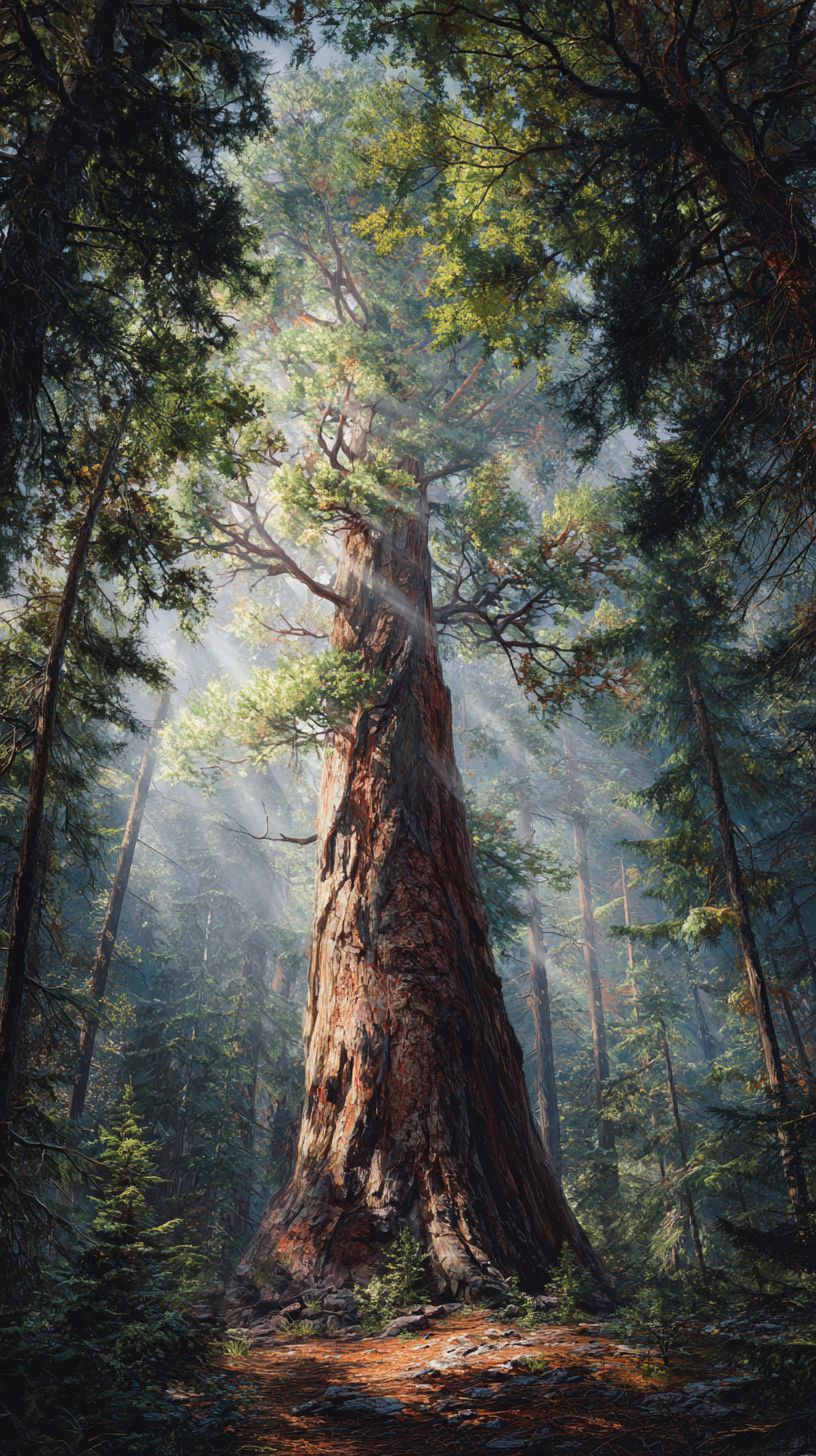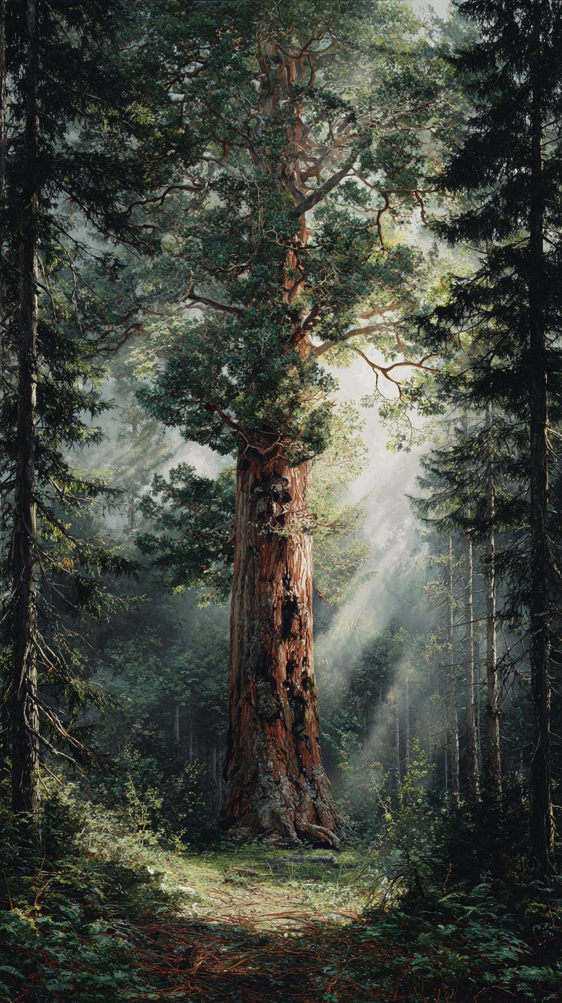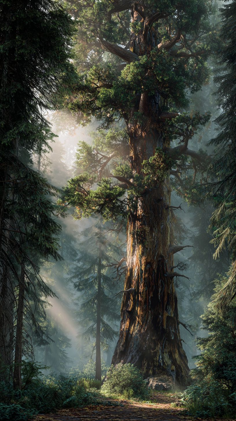 Mobile Wallpaper Download :A majestic sequoia tree in a misty forest, towering trunk with textured red-brown bark, lush green canopy with sunlight piercing through, scattered pine needles on the ground, photorealistic, dramatic and awe-inspiring.