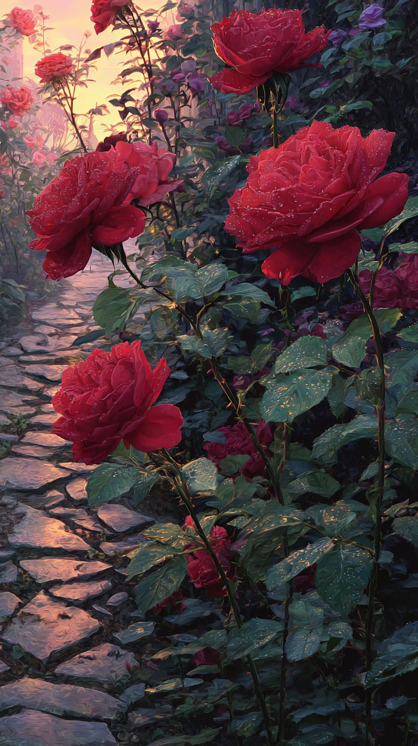 Mobile Wallpaper Download :A vibrant English rose garden at dawn, deep red roses with dew drops on thorny stems, intricate petal layers, cobblestone path winding through, soft pink sunrise glow, photorealistic detail.