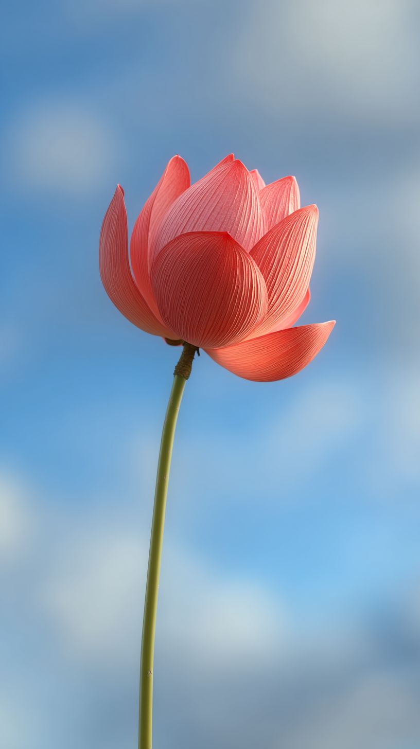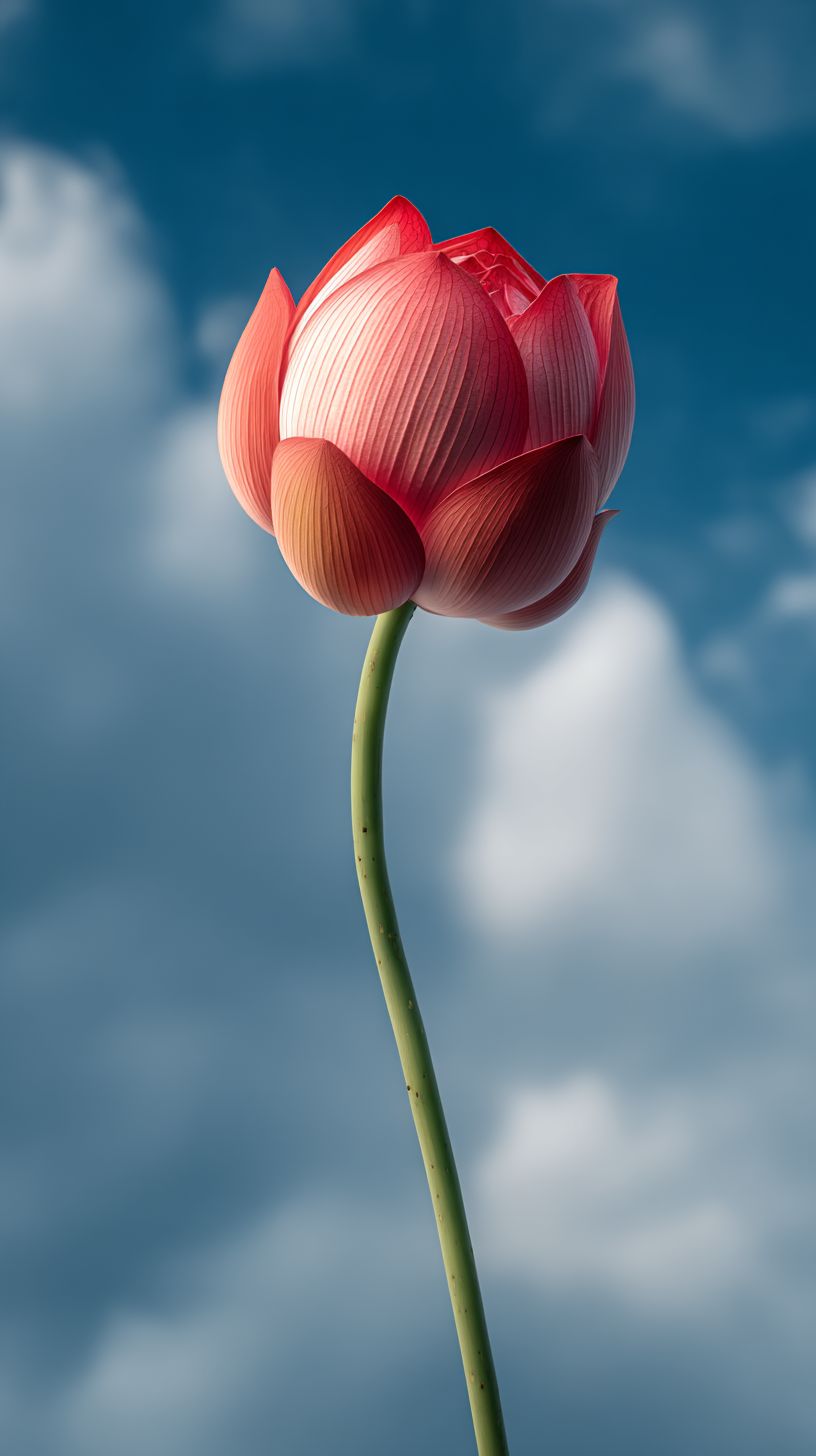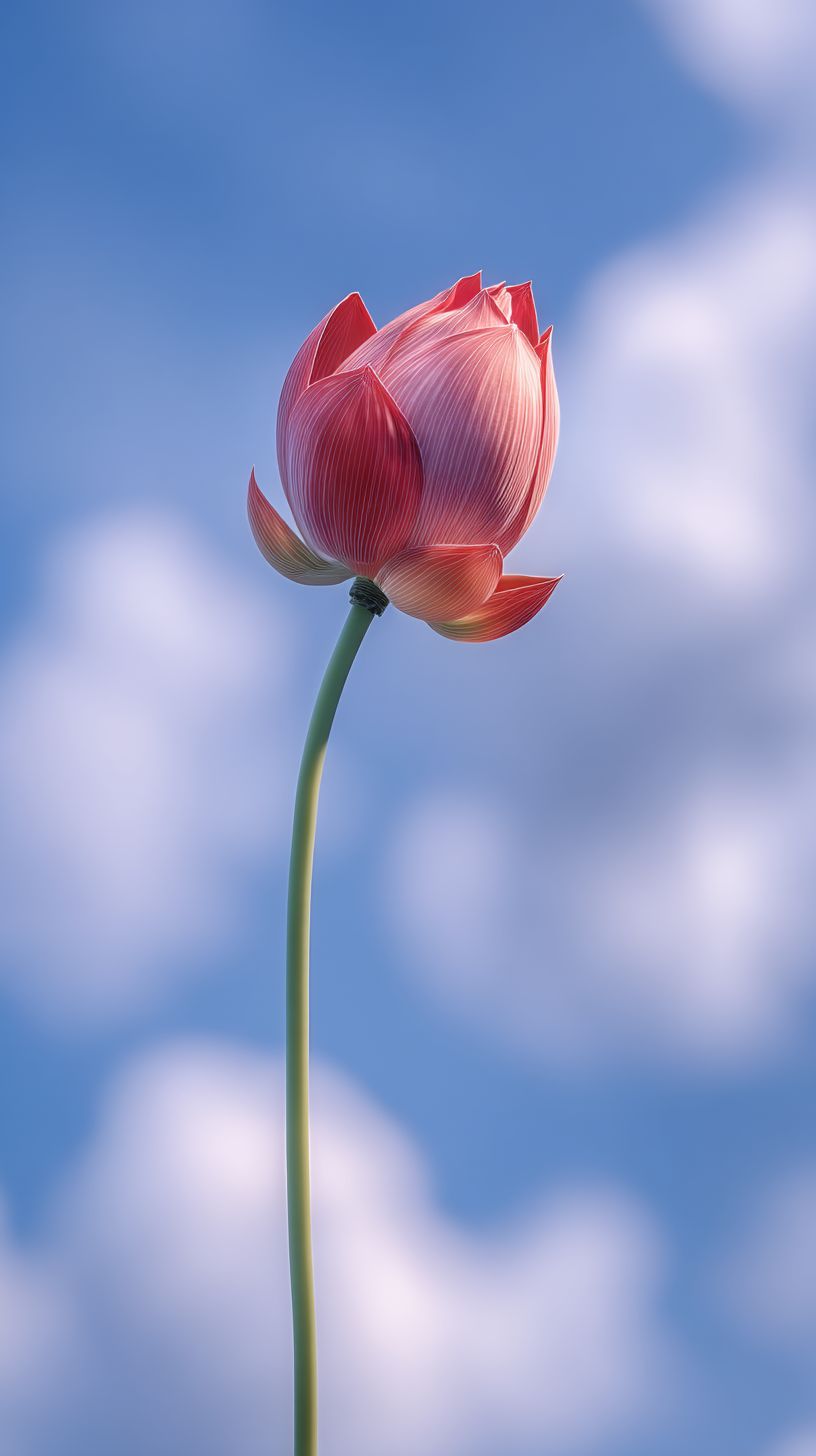 Mobile Wallpaper Download :A single red Vietnamese lotus flower bud on a long green stem, minimalist composition, 3D render, ultra-realistic lighting, soft shadows, blue sky background with white clouds, cinematic depth of field, natural sunlight, photorealistic, serene and elegant atmosphere.