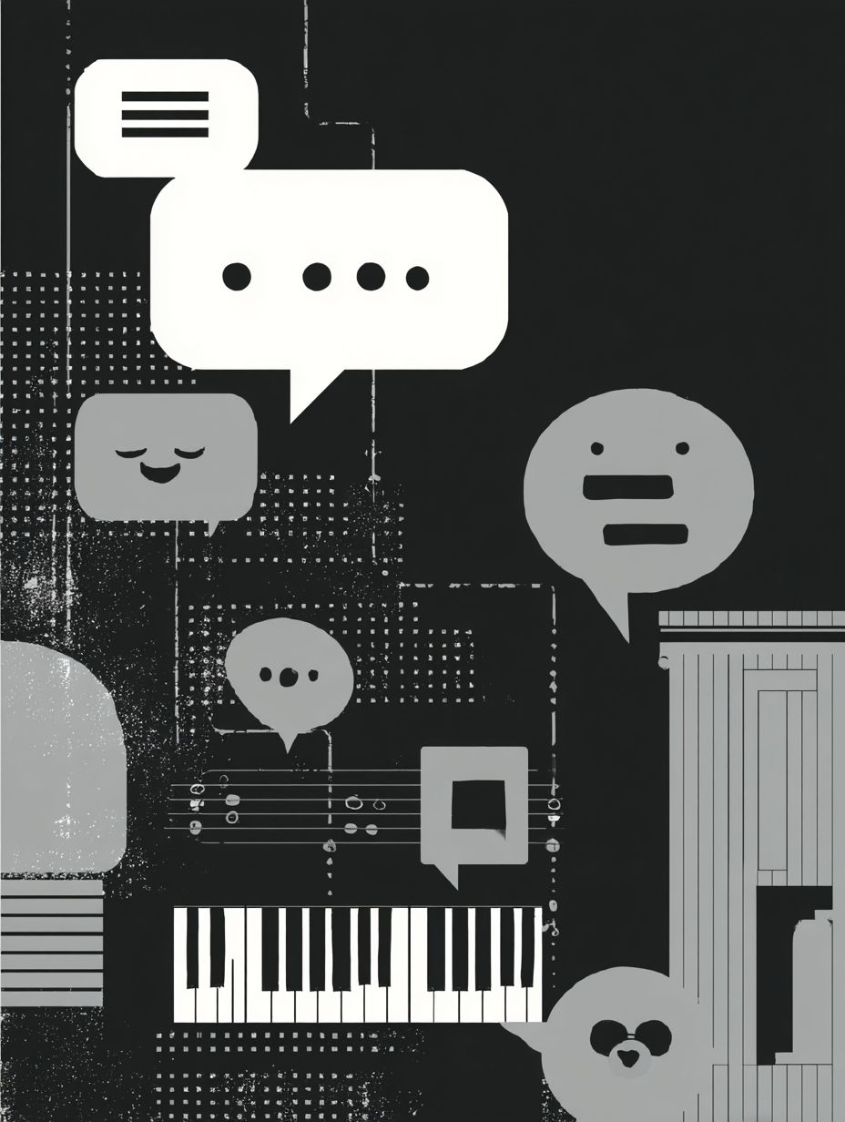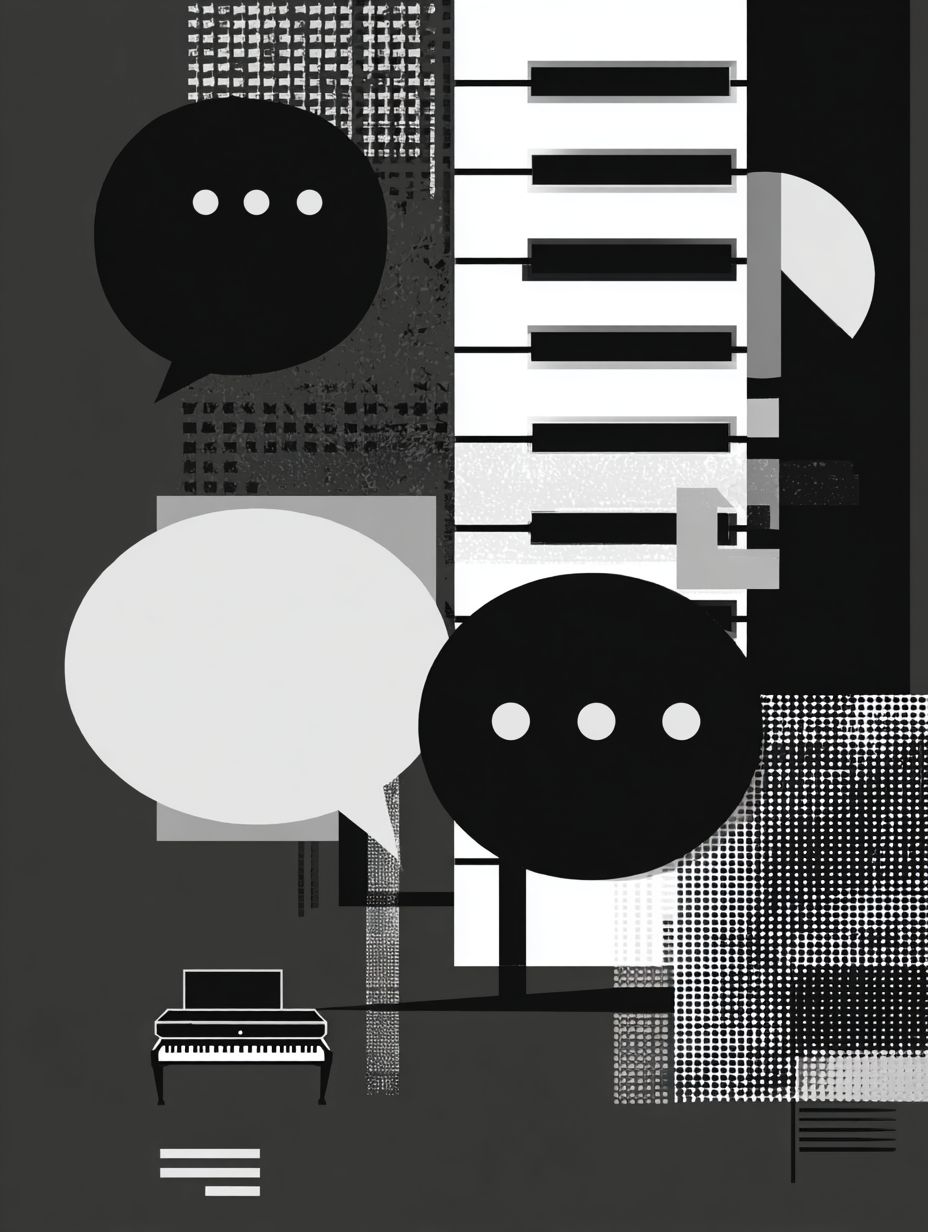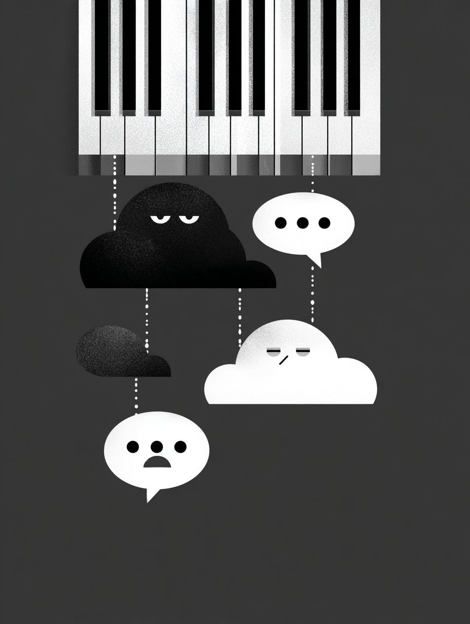 Mobile Wallpaper Download :A minimalistic black and white illustration with an architectural or musical theme, featuring four icons of exhaustion, piano keys, and speech bubbles in the style of Paul Rand's graphic design work. The background is dark gray to highlight these minimalist yet expressive symbols. There is a large space at the top left for text. High resolution, 305 mm by 486 mm.