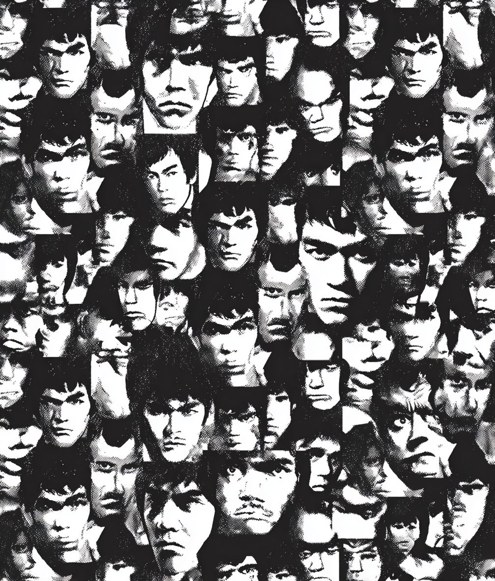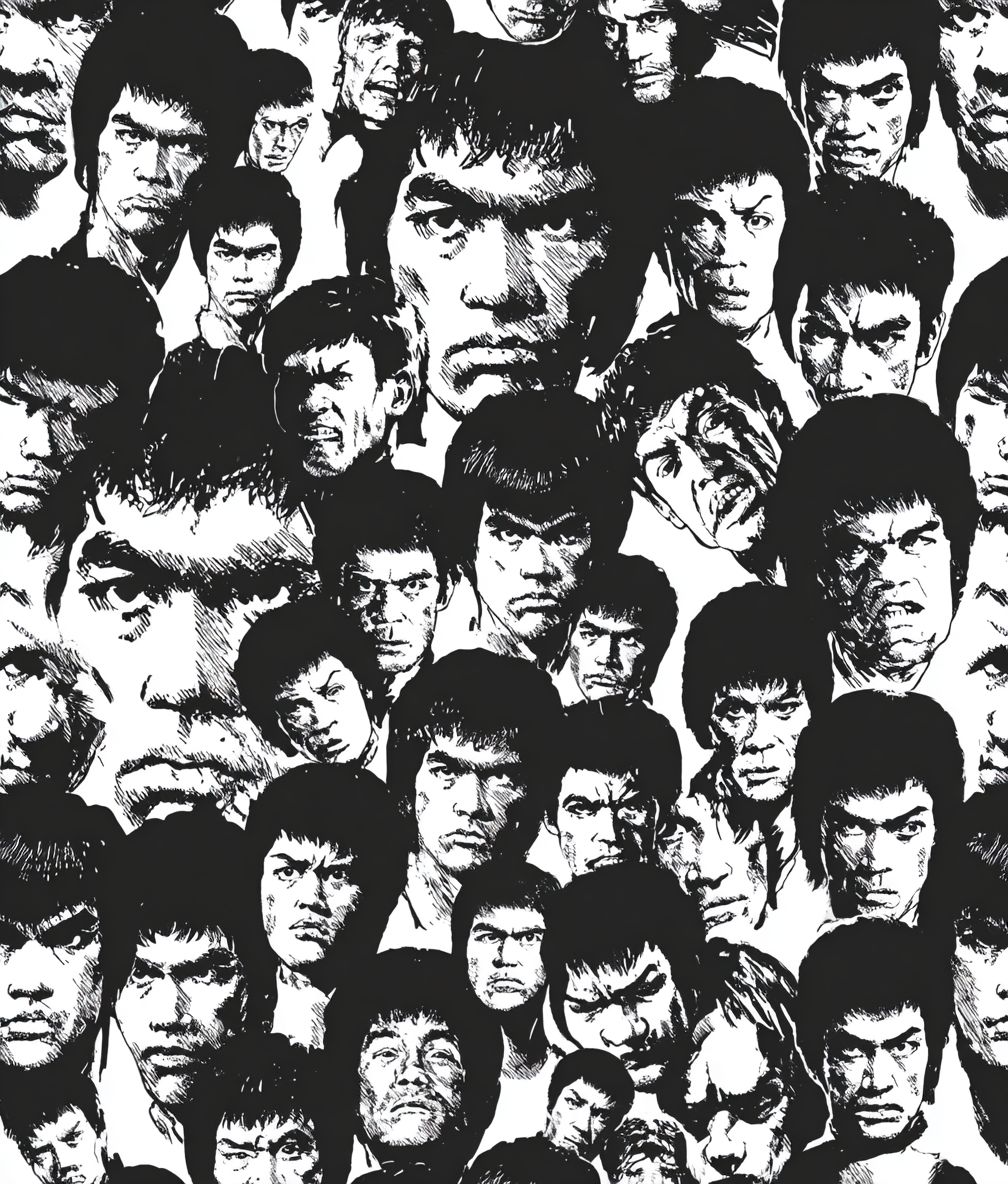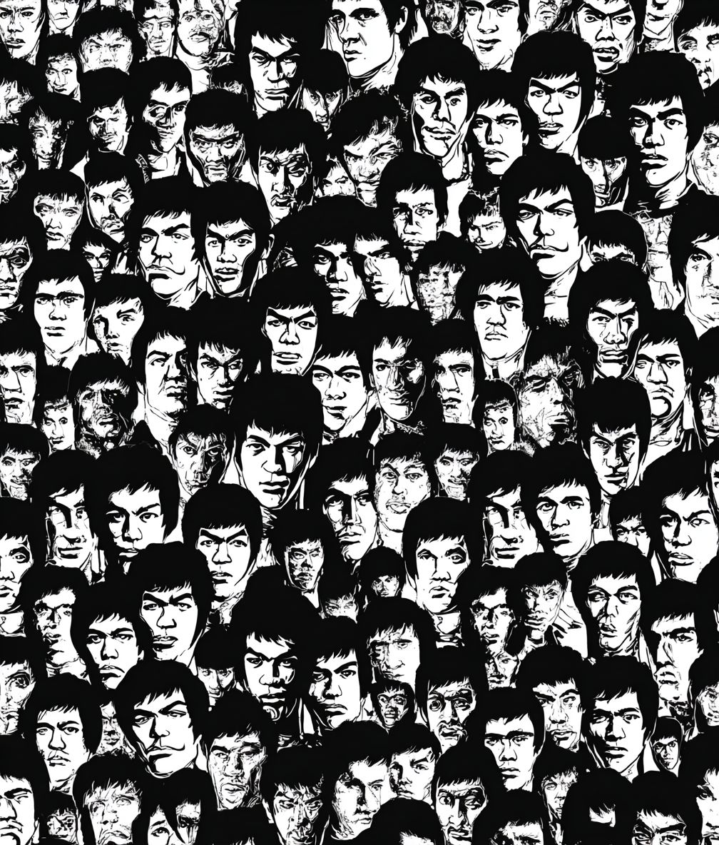 Mobile Wallpaper Download :A pattern of Bruce Lee faces in black and white, repeating to form an endless grid with no overlap between each face. The faces should be different sizes and shapes, symbolizing the diversity found within people's emotions. This design would create a visually interesting background that captures attention when printed on fabric or pieces.