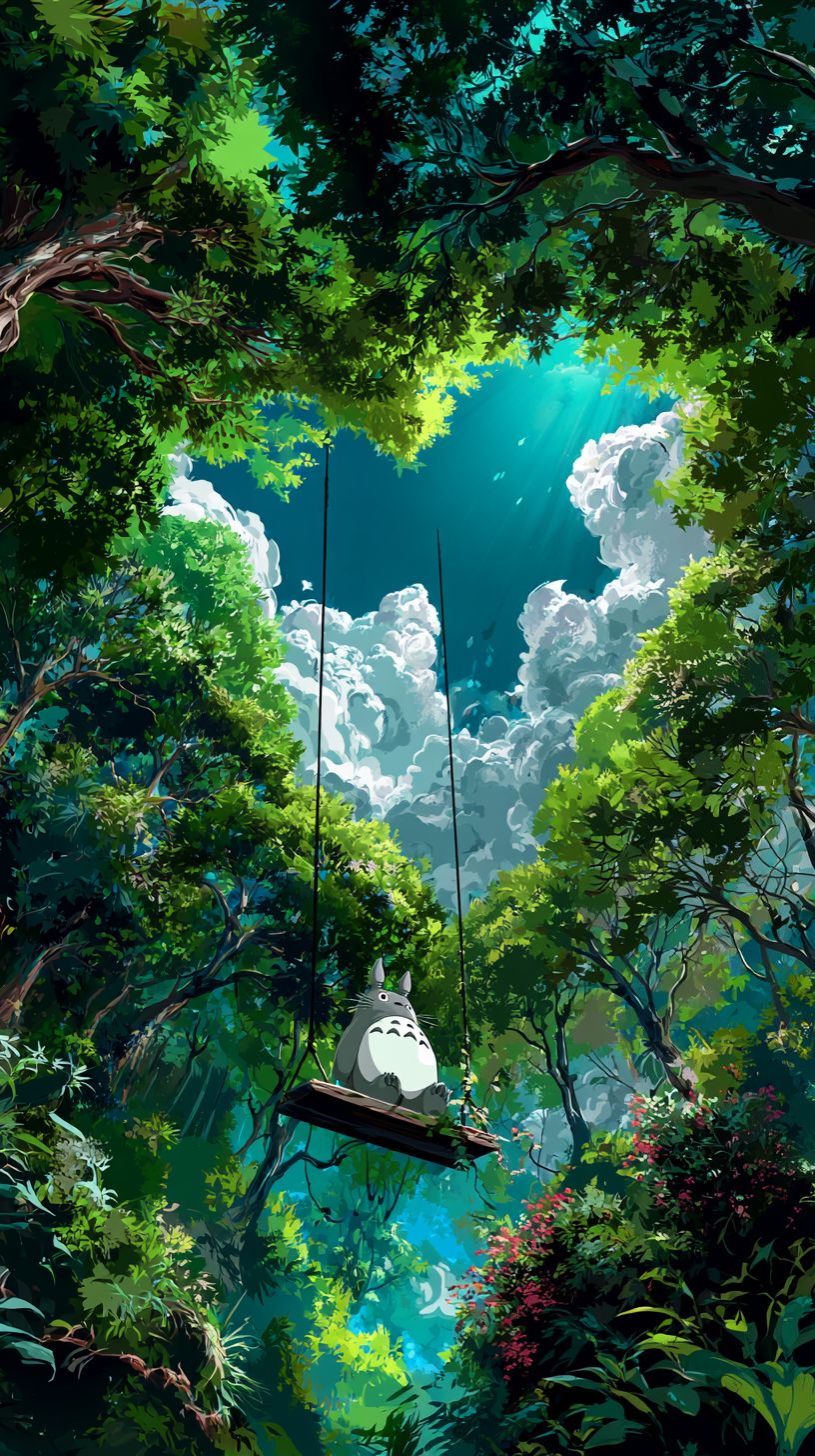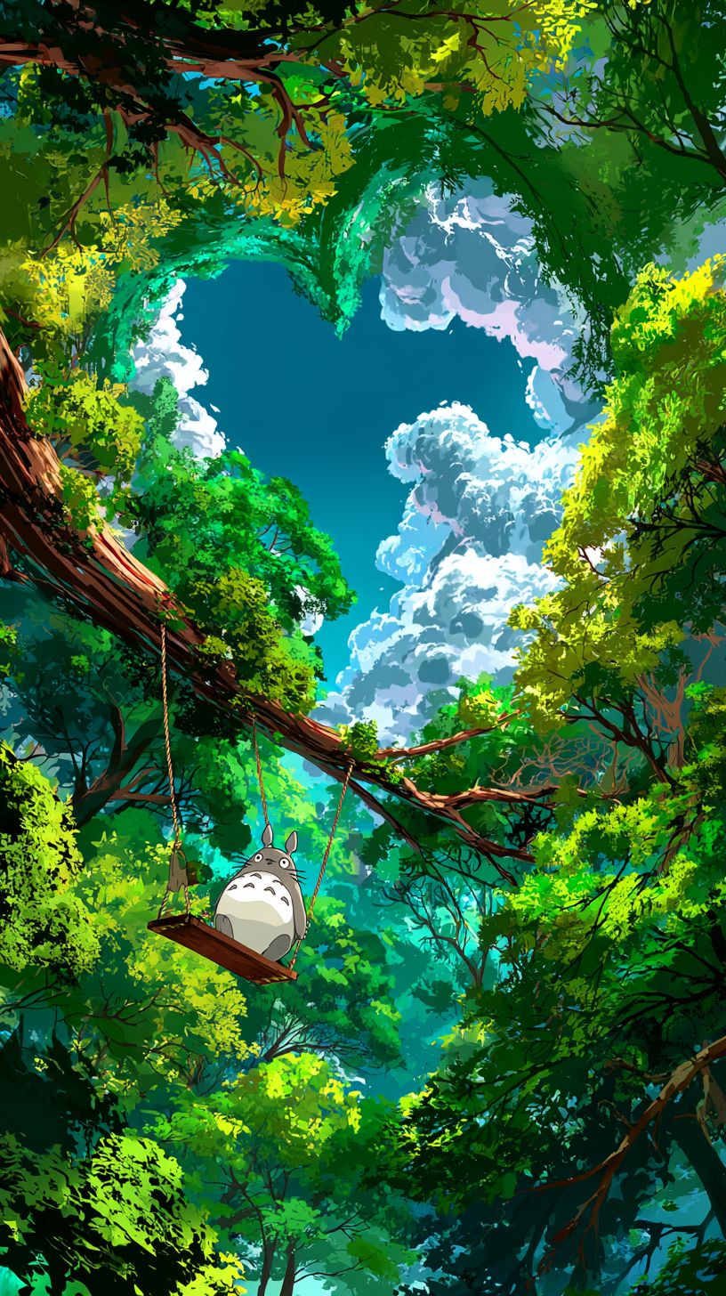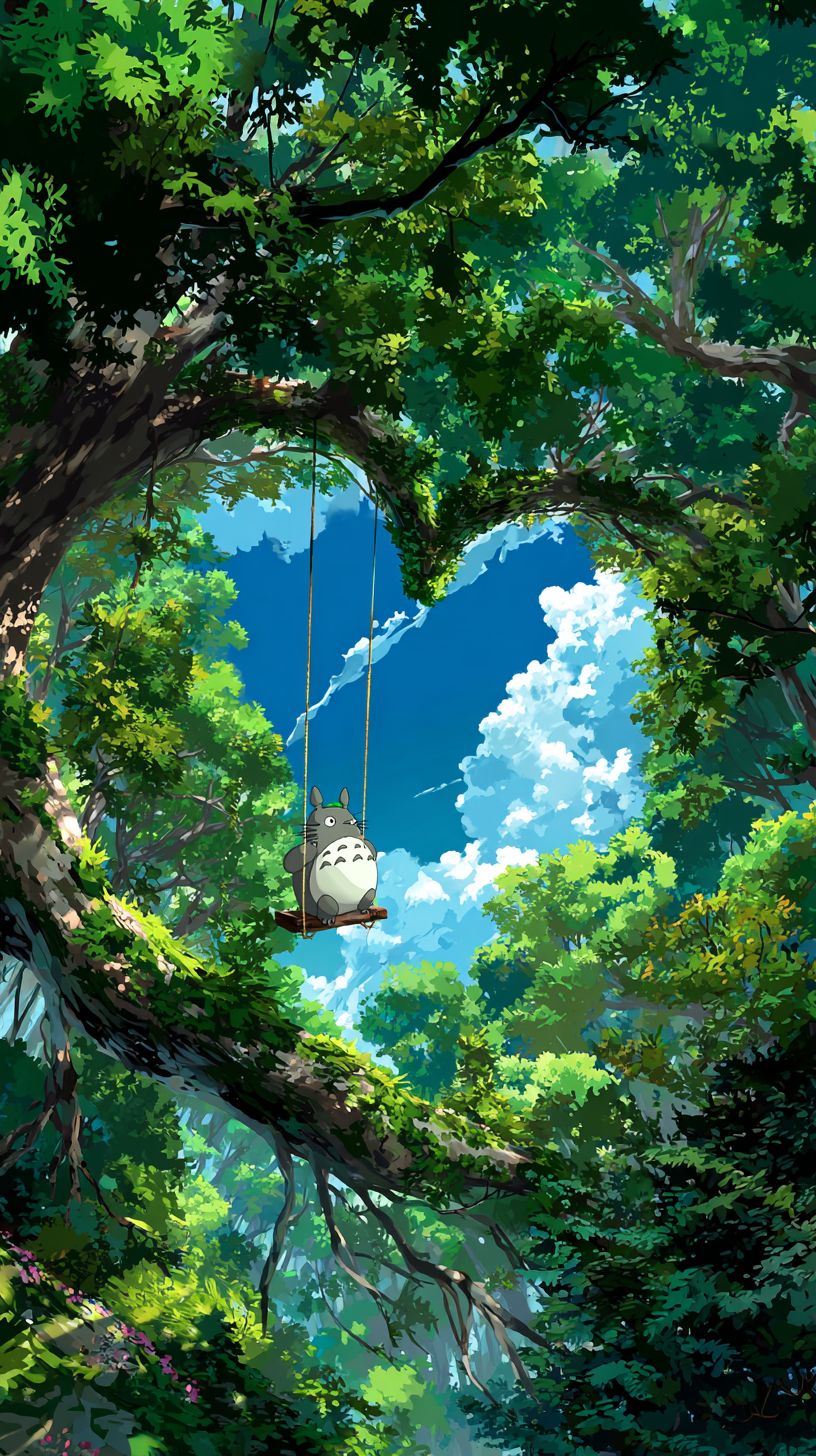 Mobile Wallpaper Download :A branch surrounded by bright and vivid emerald green woods (with grayish-white, layered branches). A white Totoro sits on a swing hanging from the branch; the scene is encircled by lush green canopies and leaves, where the interweaving green trees form a heart-shaped gap. Through the gap, the blue sky and white clouds are visible. Strong contrast between light and shadow; 4K high definition. The overall style is cartoon-like, simple, cute, and colorful, with high saturation.