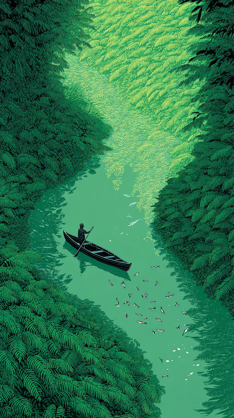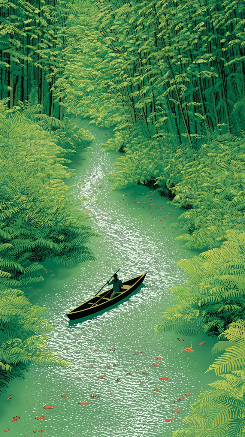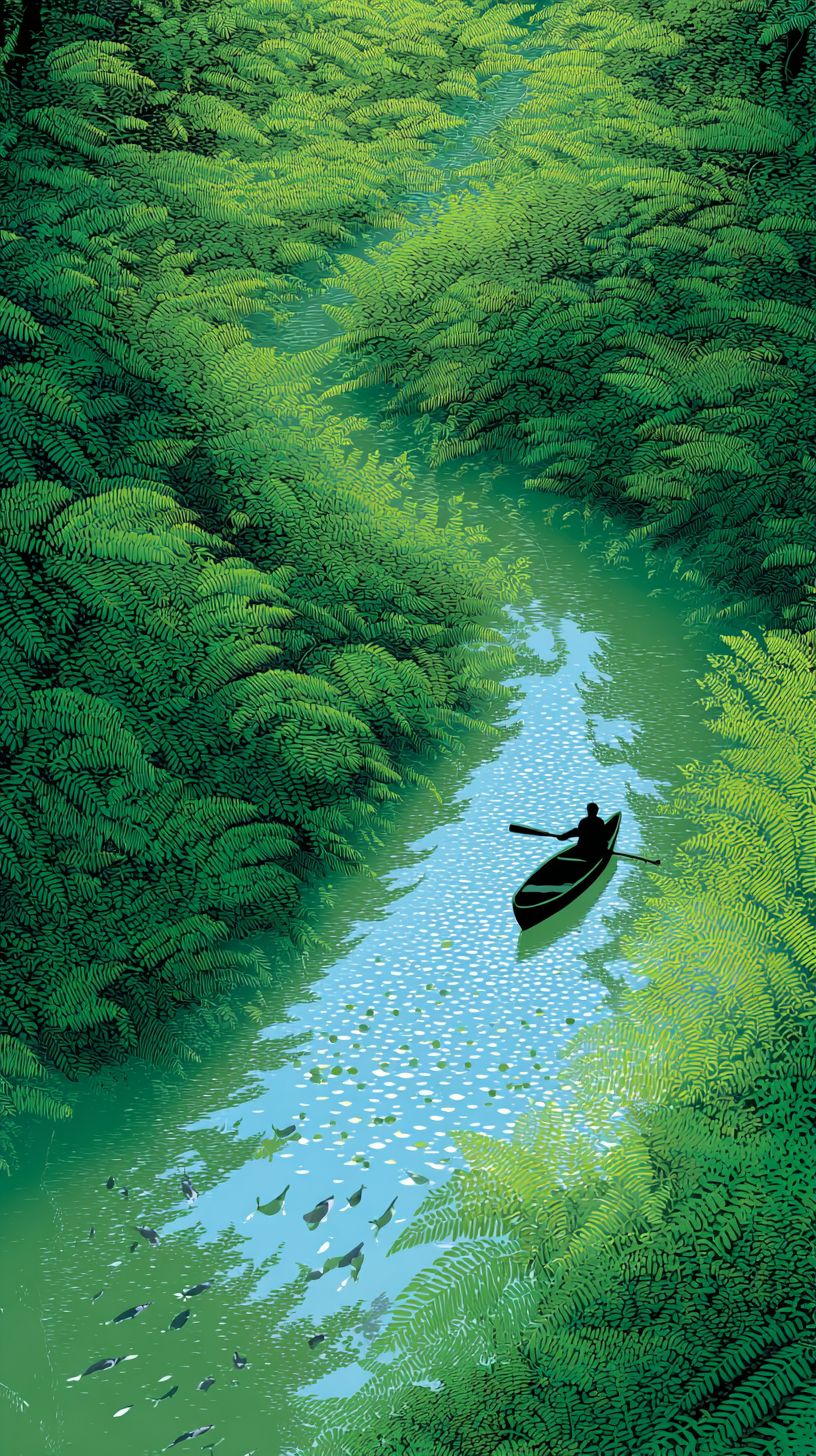 تنزيل خلفيات الهاتف :لوحة تصور مجرى مائي هادئ يتعرج عبر غابة، مع السرخس على ضفافه. تندفع أسماك صغيرة في الماء، تعكس ضوء الشمس. شخص في قارب صغير ينجرف بهدوء، ممسكًا بدفّة واحدة. بأسلوب فريدريك إدوين تشيرش، المشهد حيوي وهادئ.