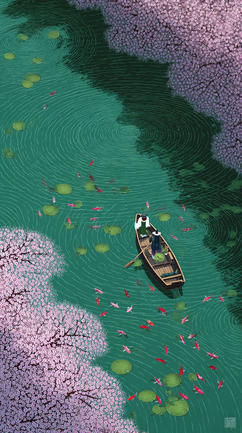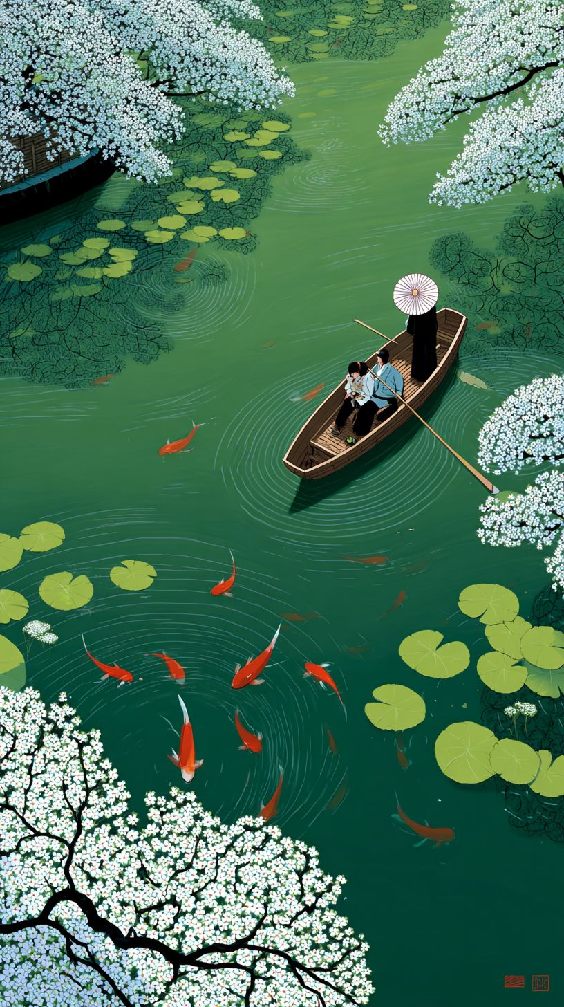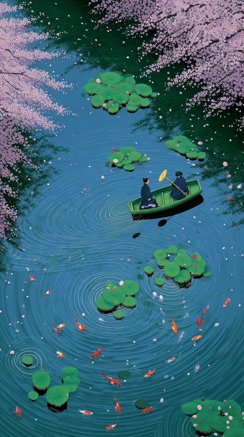 تنزيل خلفيات الهاتف :عمل فني يظهر بركة هادئة محاطة بأزهار الكرز، بتلاتها تطفو على الماء. تسبح كارب ملونة تحت أوراق زنبق الماء، مما يخلق تموجات. زوجان في قارب صغير يتجدفان برفق، أحدهما يحمل مروحة. بأسلوب أوتاغاوا هيروشيجي، تمتزج اللوحة بين الطبيعة ورشاقة الإنسان.