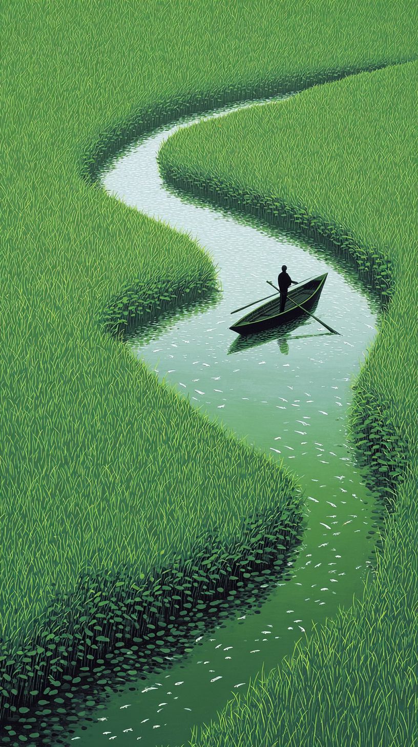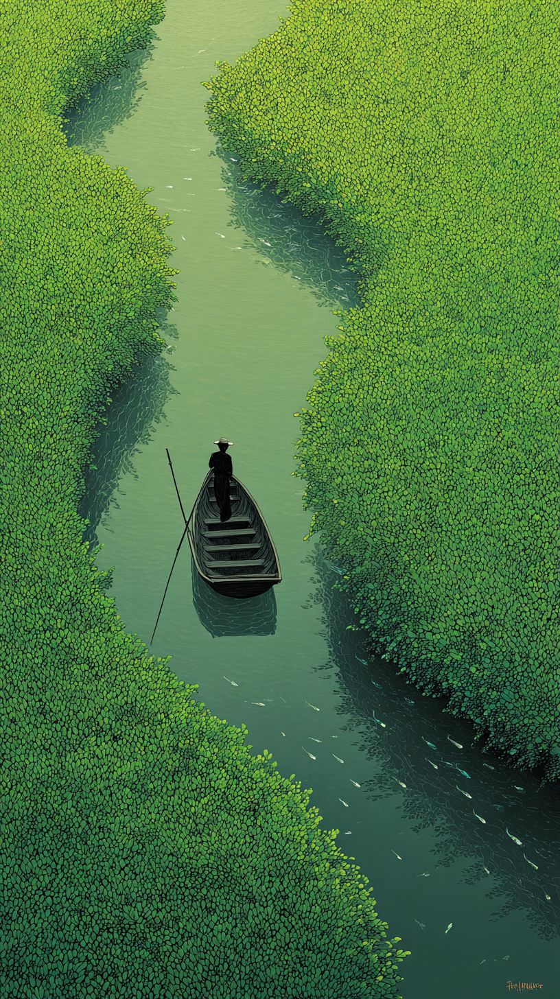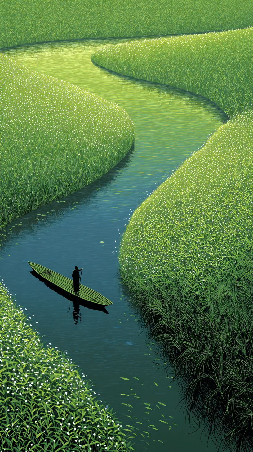 تنزيل خلفيات الهاتف :عمل فني يُظهر جدولًا هادئًا يتعرج عبر مرج، مع الجرجير على حوافه. تنزلق الأسماك الفضية تحت المياه، لالتقاط ضوء الصباح. شخصية وحيدة في قارب تجديف تطفو، تحمل قضيبًا مصنوعًا من الخيزران. بأسلوب توماس إيكنز، اللوحة واقعية وهادئة.