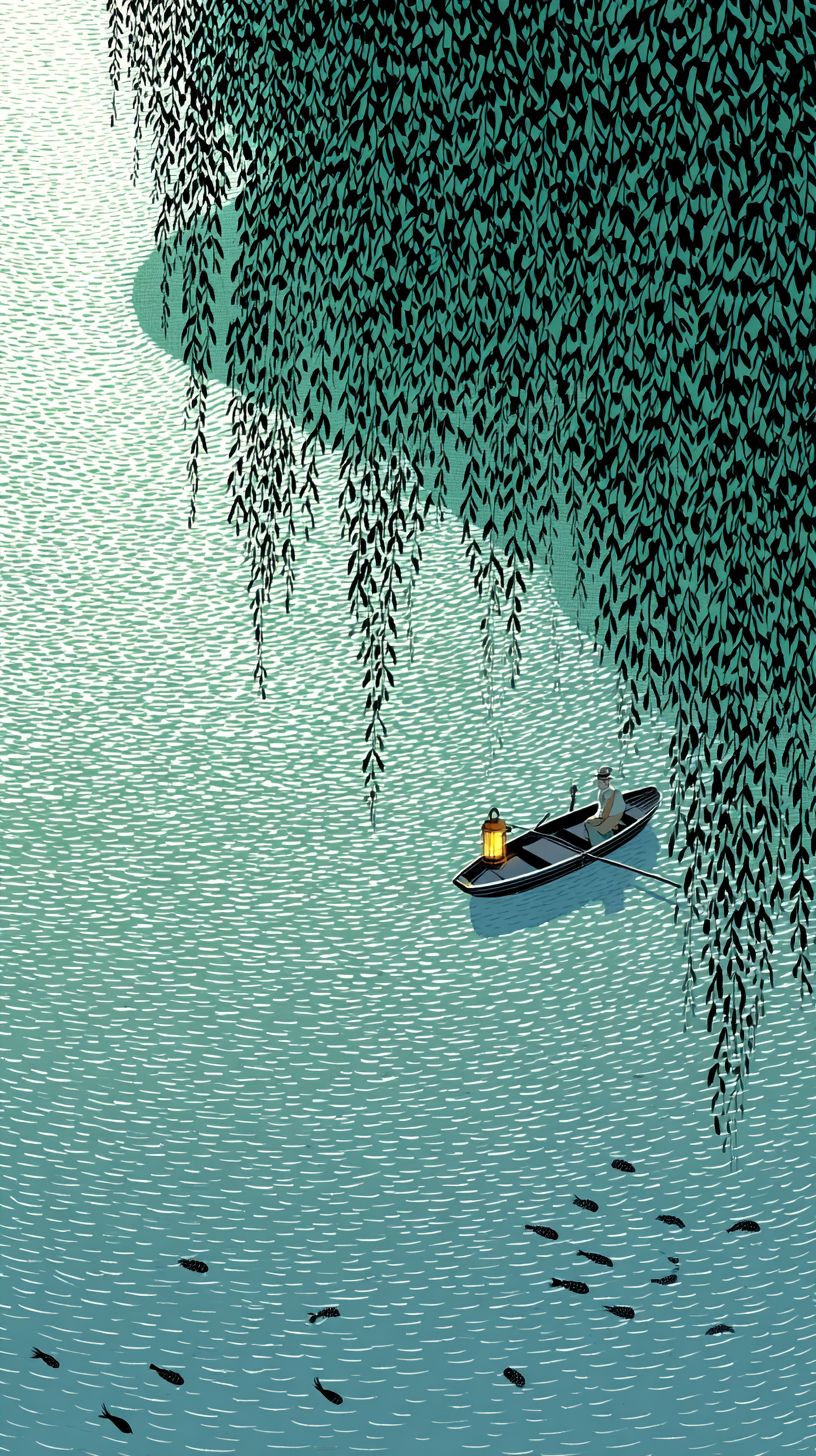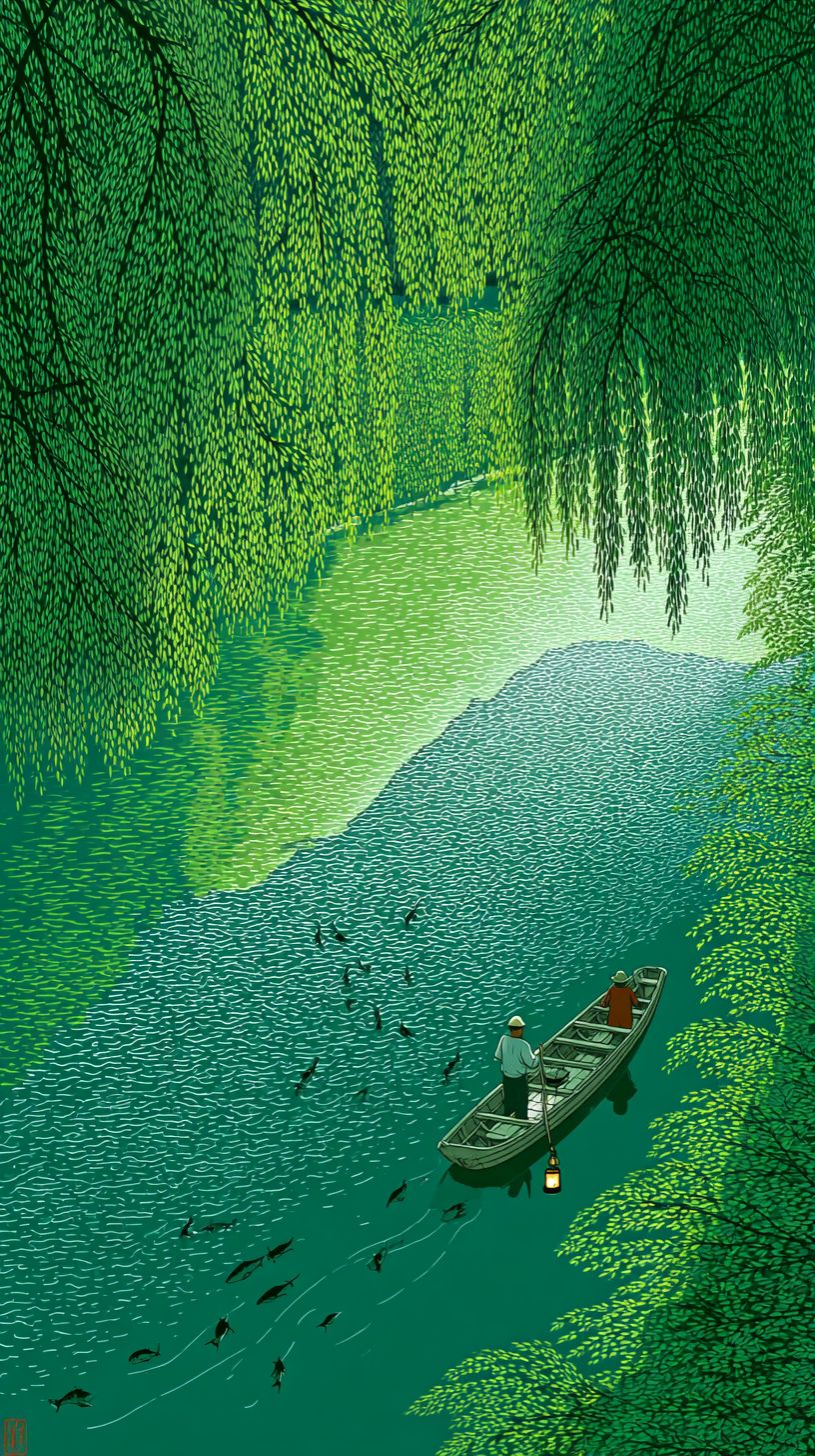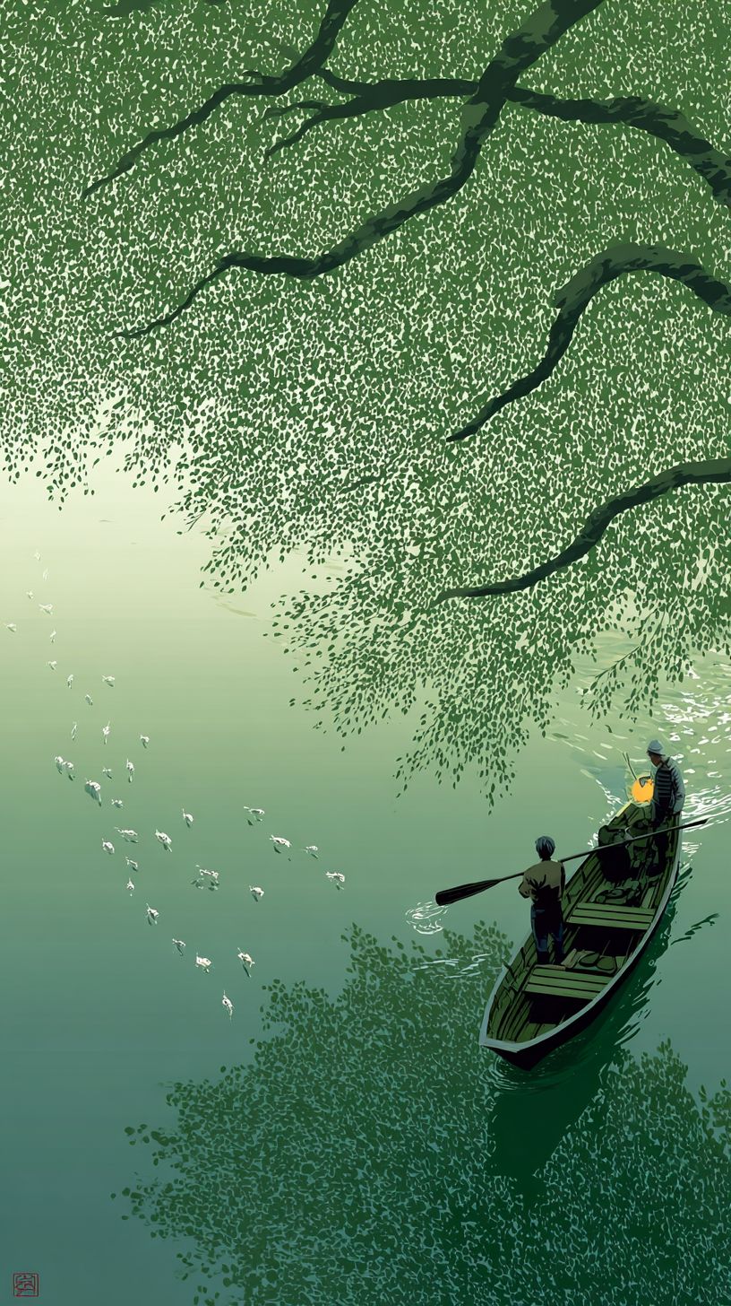 تنزيل خلفيات الهاتف :رسم لنهر هادئ عند شروق الشمس، مع فروع متدلية تلقي ظلال منقطة. تسبح أسماك صغيرة عبر الماء الصافي، ملتقطة الضوء. زوجان في قارب ضيق يجدفان برفق، أحدهما يحمل فانوسًا. بأسلوب أندرو وايث، العمل بالفن متواضع وهادئ.