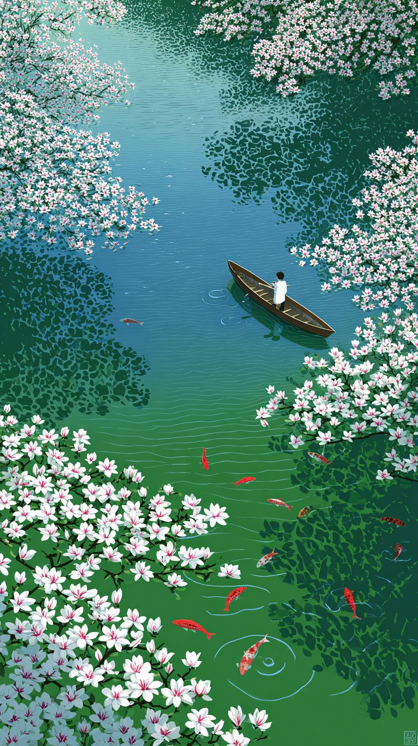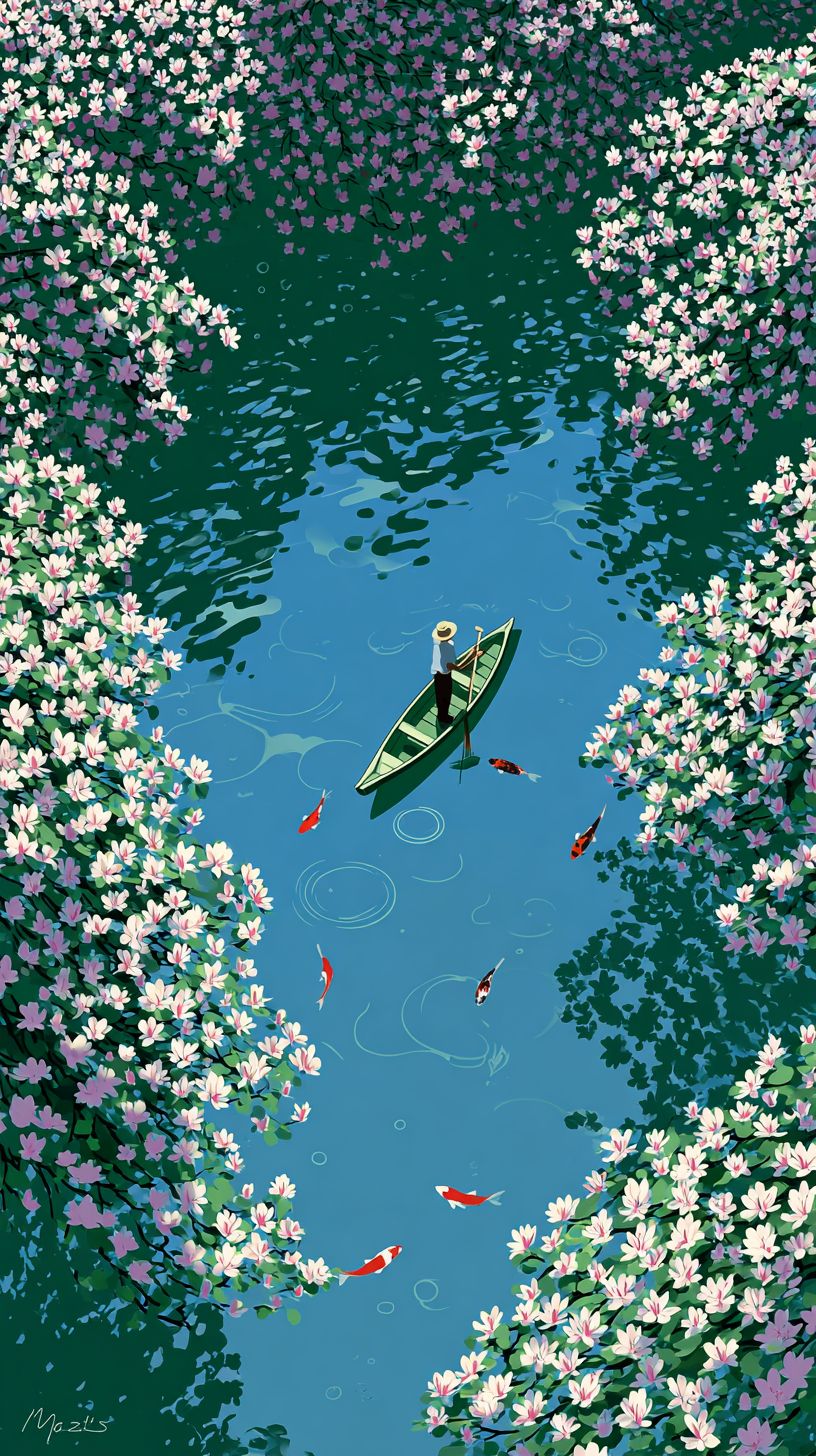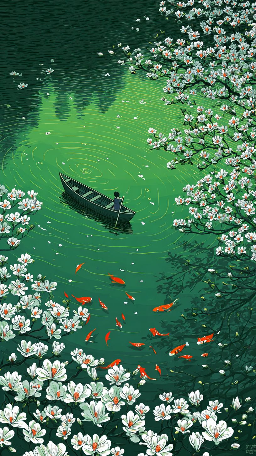 تنزيل خلفيات الهاتف :صورة توضيحية لبحيرة هادئة محاطة بأشجار الماغنوليا المتفتحة، حيث تنعكس بتلاتها على الماء. تسبح أسماك الكوي كسولة تحتها، محدثة تموجات. شخص ما في قارب صغير يجذف برفق، محاطًا بالأزهار النابضة بالحياة. بأسلوب أنري فانتان لاتور، العمل الفني رقيق وهادئ.