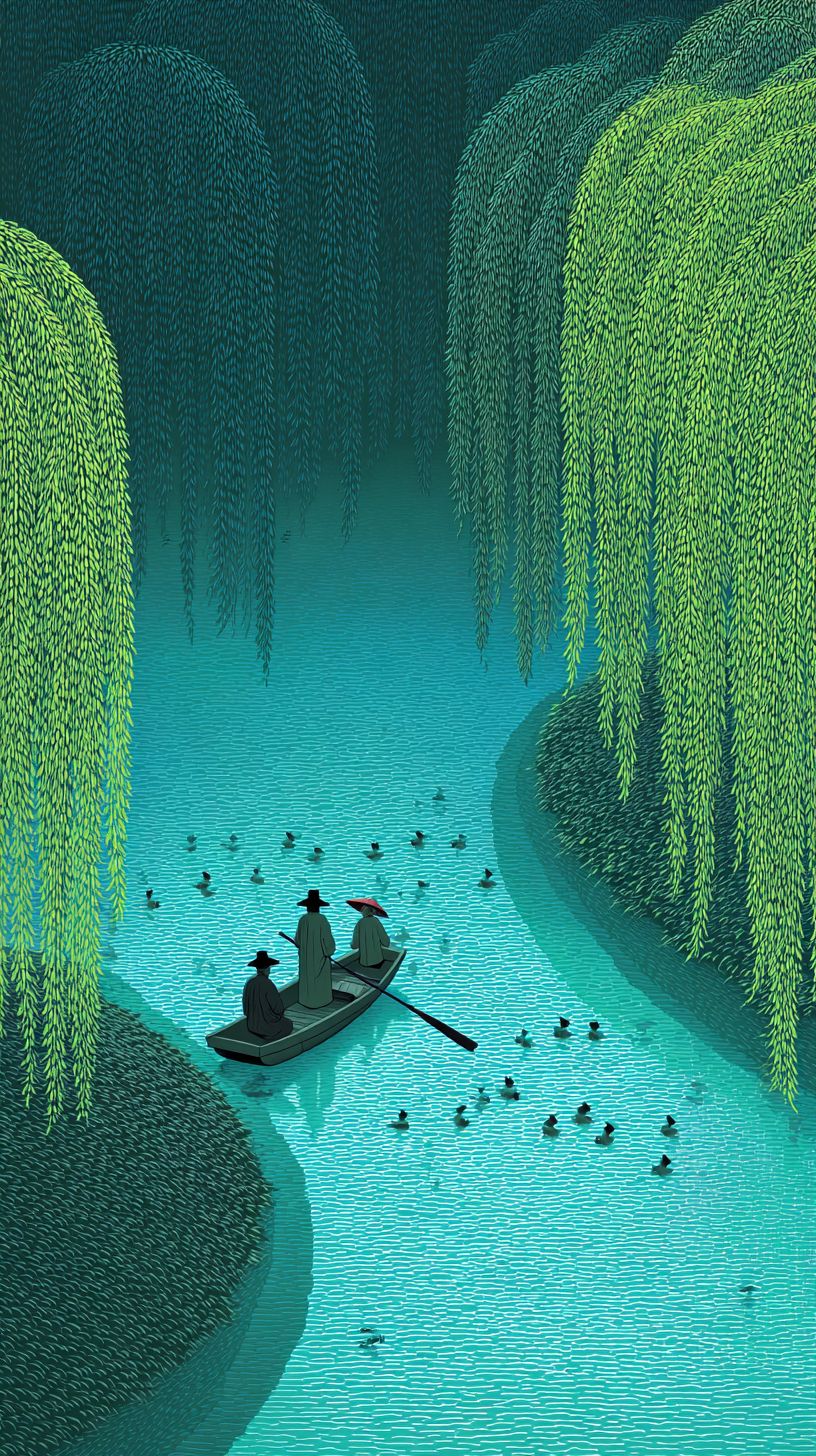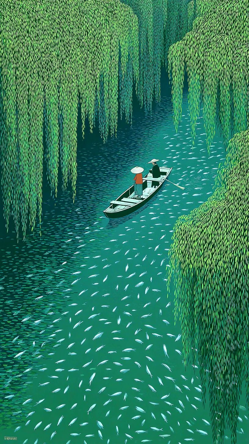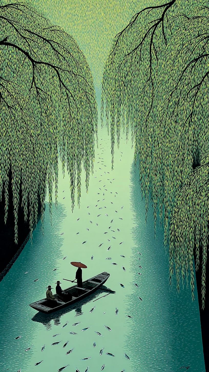 تنزيل خلفيات الهاتف :لوحة بجدول هادئ عند الغسق، مع سيوف معلقة تلقي ظلالا ناعمة. تسرع الأسماك الفضية عبر المياه الصافية، حيث تلتقط الضوء الذي يتلاشى. شخصان في قارب ضيق يتجدفا برفق، بينما يحمل أحدهما مظلة. بأسلوب جيمس ويسلر، المشهد حساس ومتناغم.