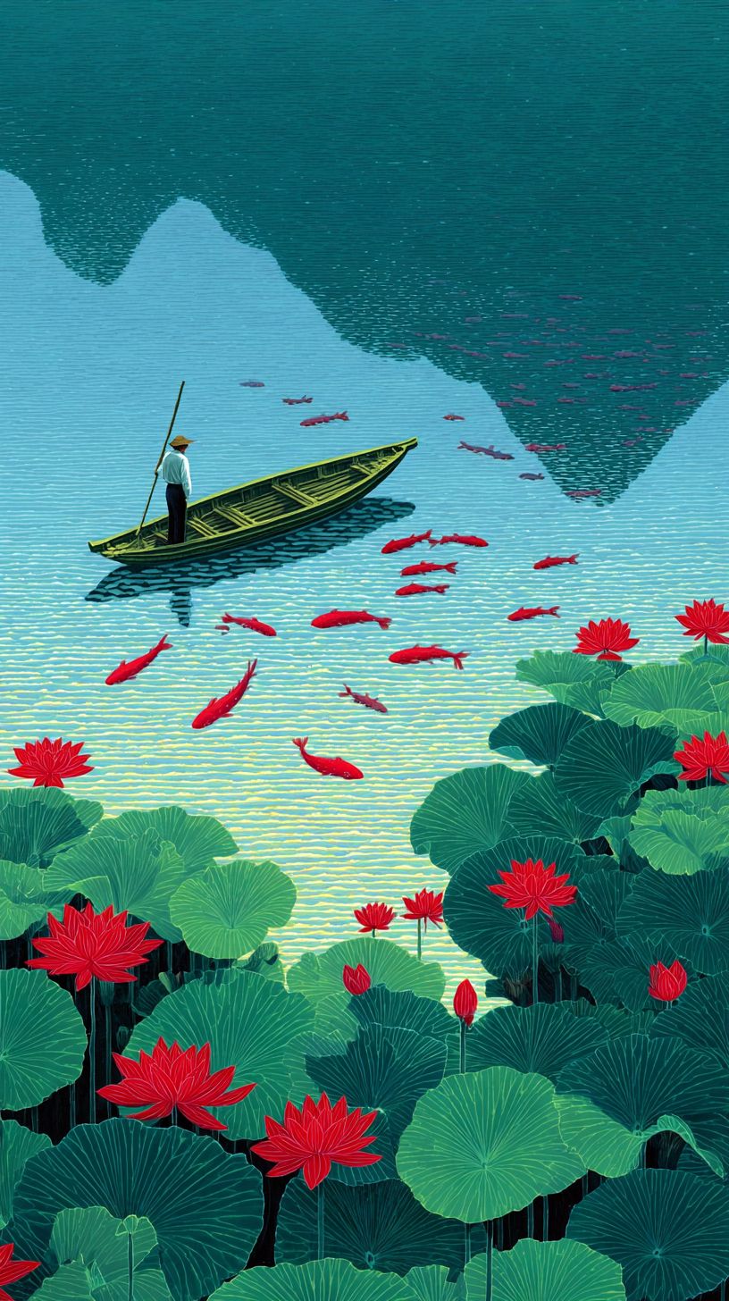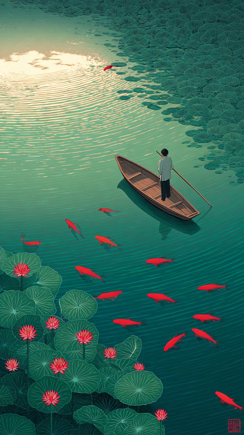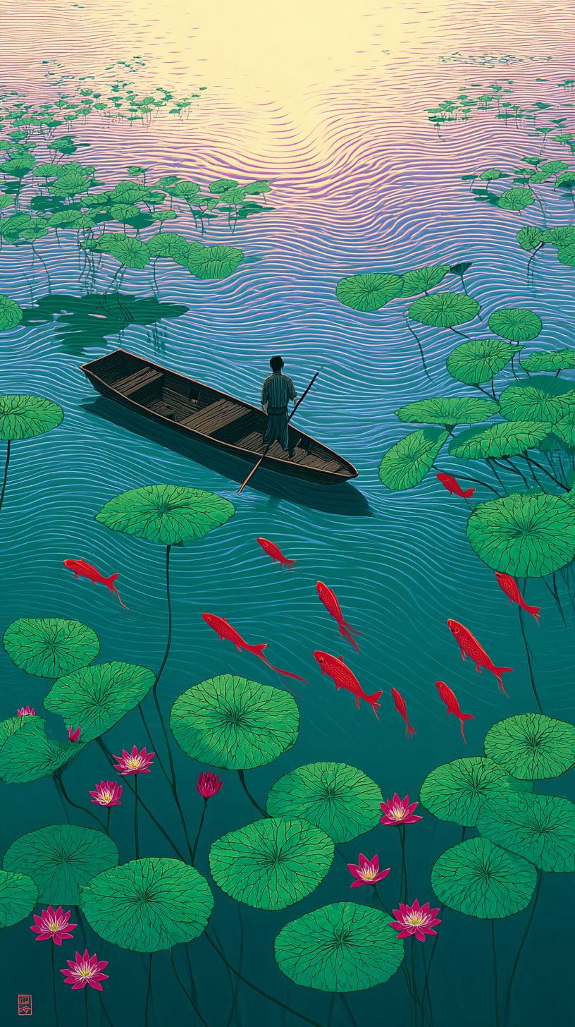 تنزيل خلفيات الهاتف :عمل فني يصور بركة هادئة عند شروق الشمس، حيث تتفتح أزهار اللوتس بشكل نابض تحت ضوء خافت. تسبح السمكة الحمراء تحتها، وتحرك حركتها الماء. شخصية وحيدة في قارب خشبي تت漂流، ممسكة بعصا من الخيزران. بأسلوب جون لا فارج، اللوحة ملونة وهادئة.
