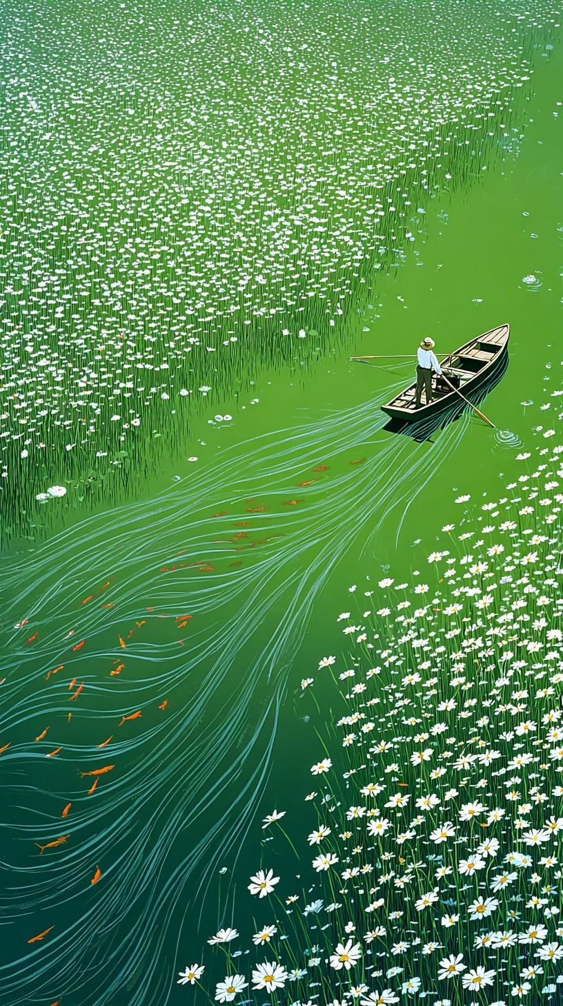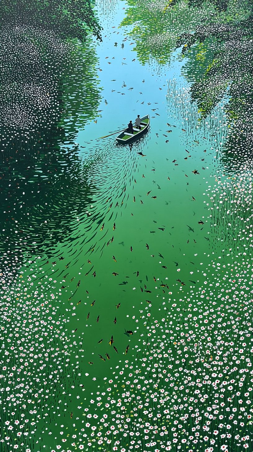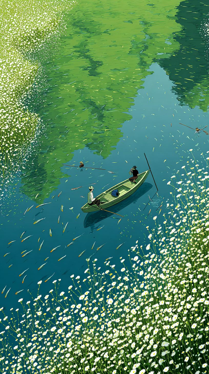 تنزيل خلفيات الهاتف :لوحة لنهر هادئ محاط بالزهور البرية، حيث تتراقص انعكاساتها على الماء. تسبح الأسماك الصغيرة في أسراب، تلتقط أشعة الشمس. زوجان في قارب صغير يتجدفان ببطء، بينما تترك أحدهما يده في الماء. بأسلوب بيرث موريزو، المشهد خفيف وهادئ.