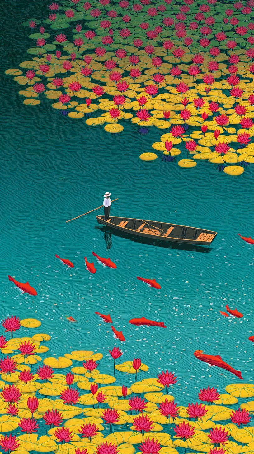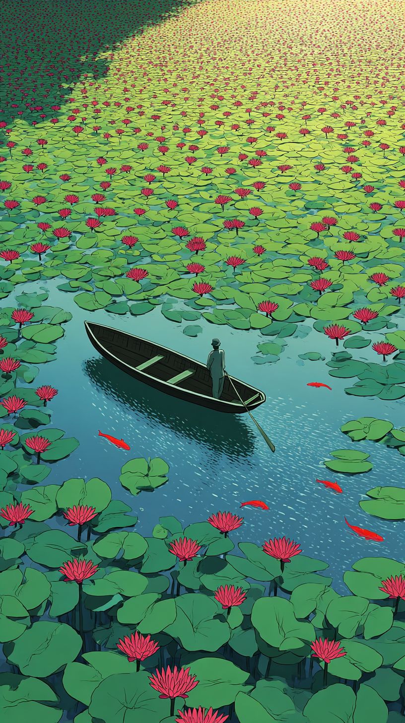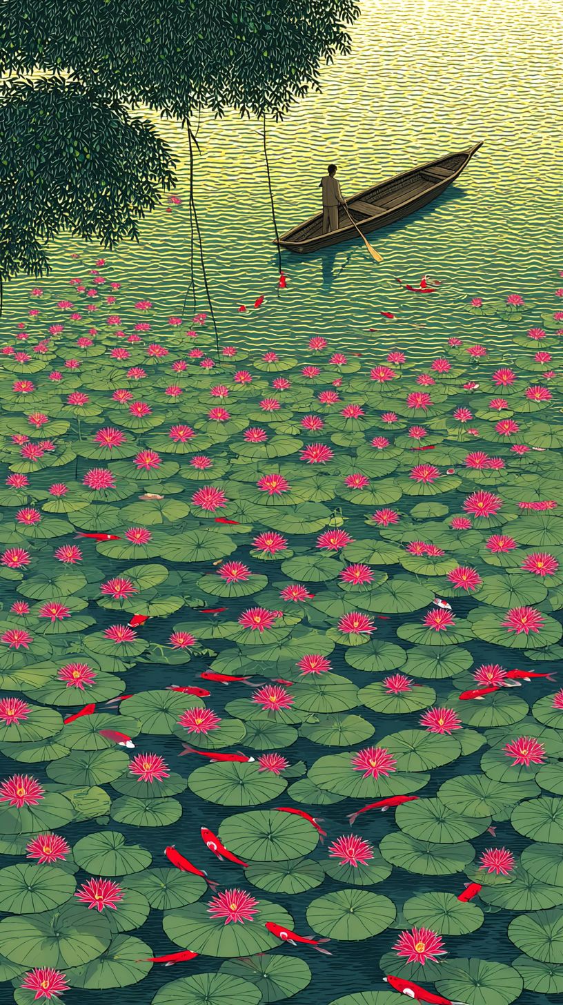 Téléchargement de fonds d'écran pour téléphone :Une peinture sereine d'un étang couvert de vibrants nénuphars, dont les fleurs roses brillent sous le soleil doré. Des carpes rouges nagent en dessous, créant des ondulations délicates. Une personne dans une barque à fond plat dérive, traînant une main dans l'eau. Dans le style de John Constable, la scène mélange la tranquillité humaine avec la beauté de la nature.