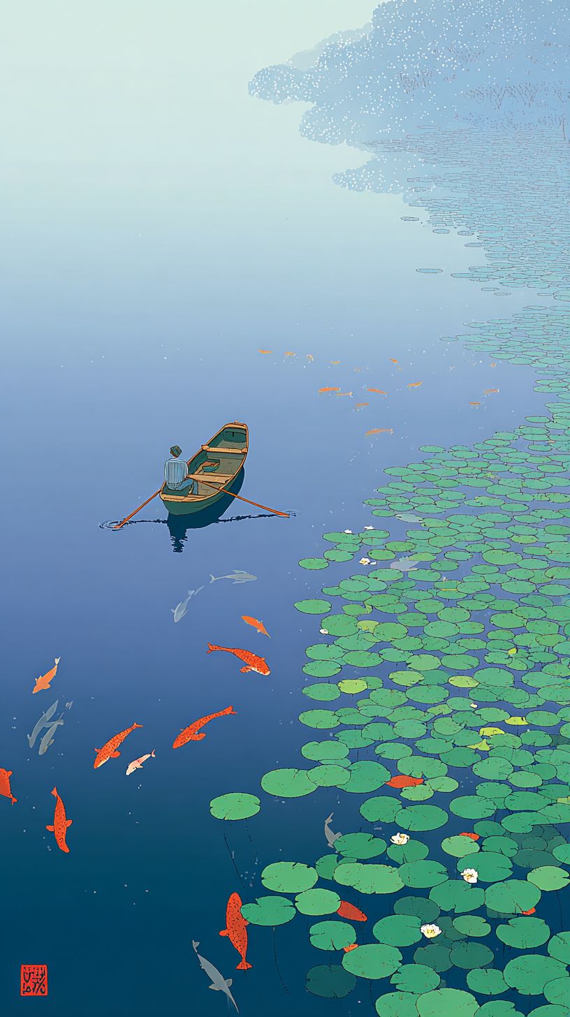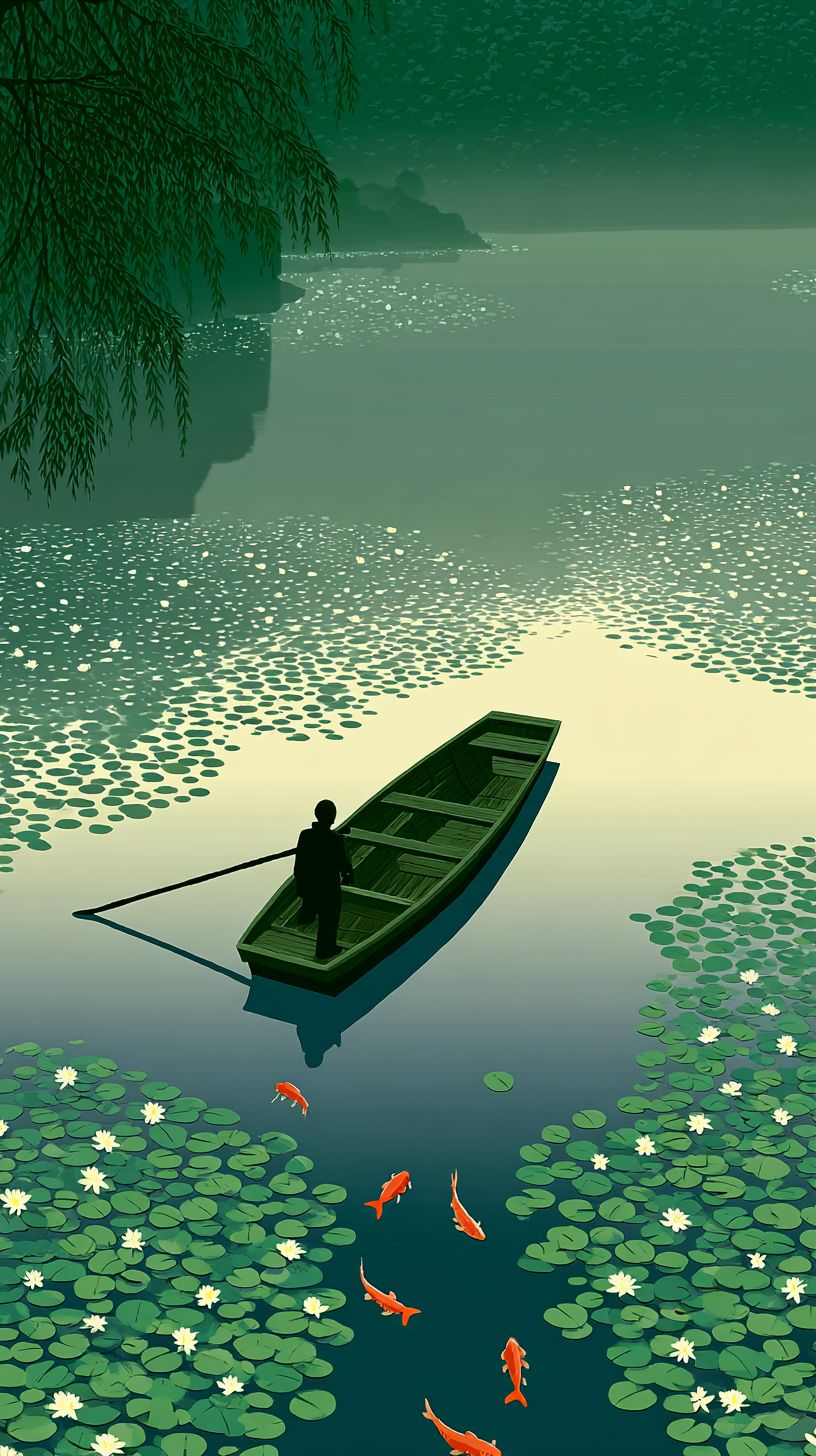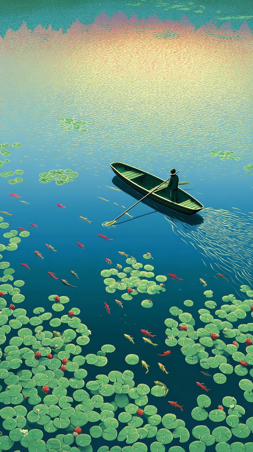 Téléchargement de fonds d'écran pour téléphone :Une illustration d'un lac serein au lever du soleil, avec une brume délicate s'élevant de l'eau. Des nénuphars parsèment la surface et des carpes colorées nagent en dessous. Une personne dans une petite barque glisse silencieusement, tenant une rame en bois. Dans le style de Childe Hassam, l'œuvre brille d'une lumière douce et de tranquillité.