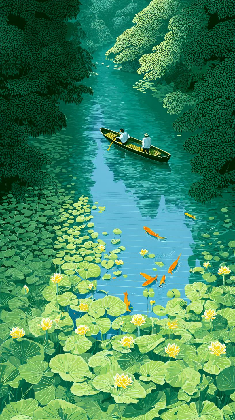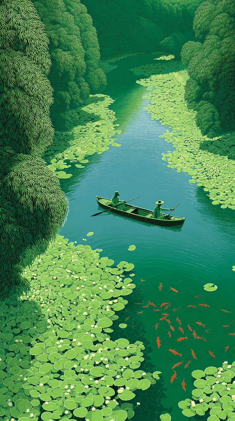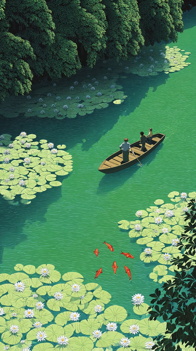Téléchargement de fonds d'écran pour téléphone :Une peinture capturant une rivière sereine à midi, avec des nénuphars flottant à la surface de l'eau claire. Des poissons dorés glissent en dessous, leurs écailles scintillant. Deux personnes dans une barque en bois rament doucement, entourées d'une végétation luxuriante. Dans le style de Thomas Moran, la scène rayonne de splendeur naturelle.