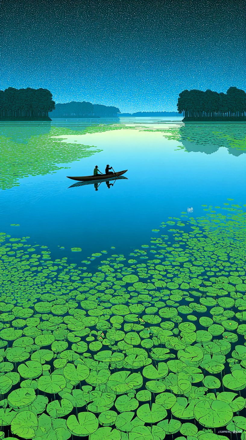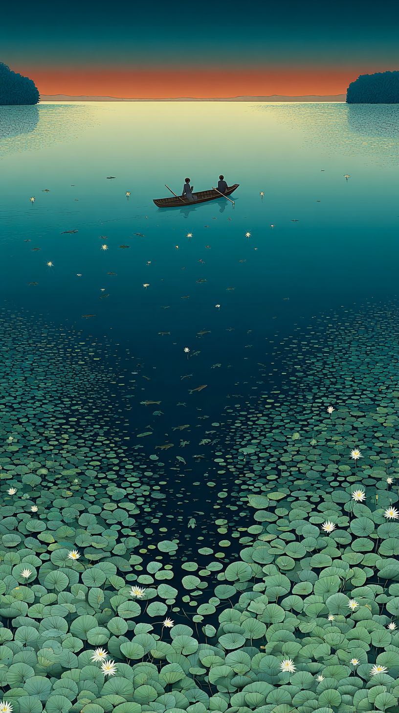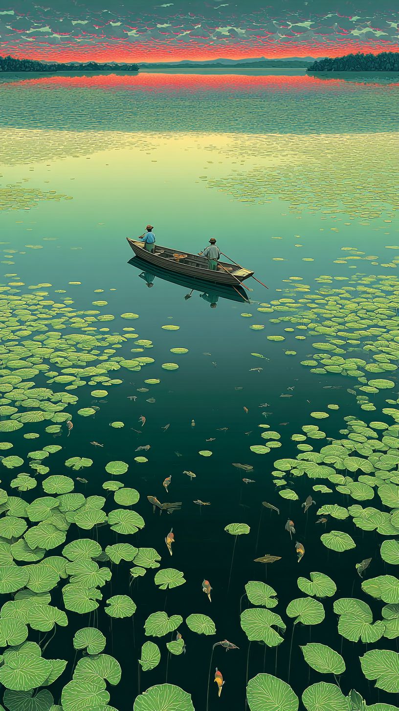 Téléchargement de fonds d'écran pour téléphone :Une œuvre d'art d'un lac tranquille au crépuscule, où des nénuphars flottent à la surface de l'eau calme. Des carpes argentées glissent en dessous, leurs mouvements capturant la lumière déclinante. Deux figures dans une barque en bois rame doucement, encadrées par la douce lueur de l'horizon. Dans le style de Maxfield Parrish, la peinture est vibrante et onirique.