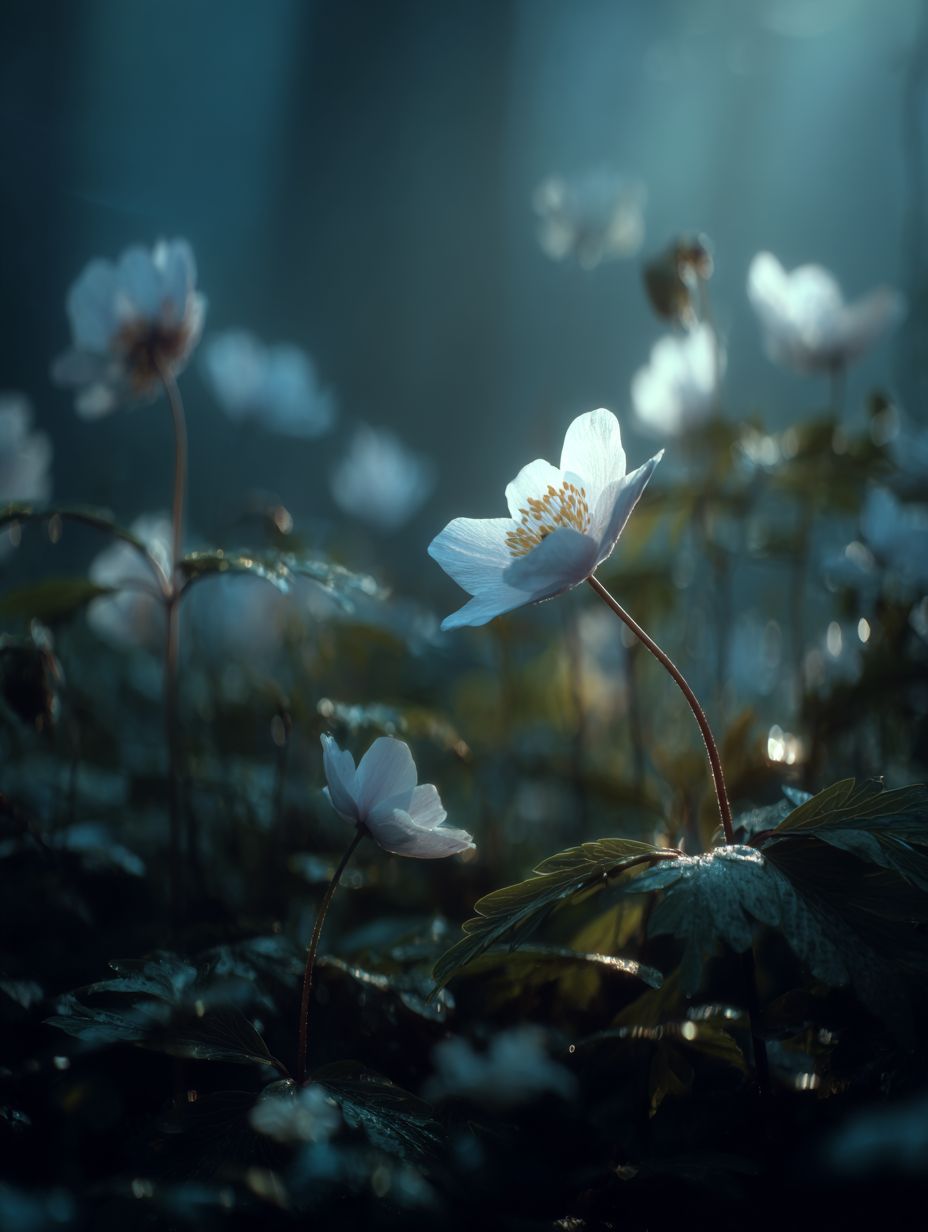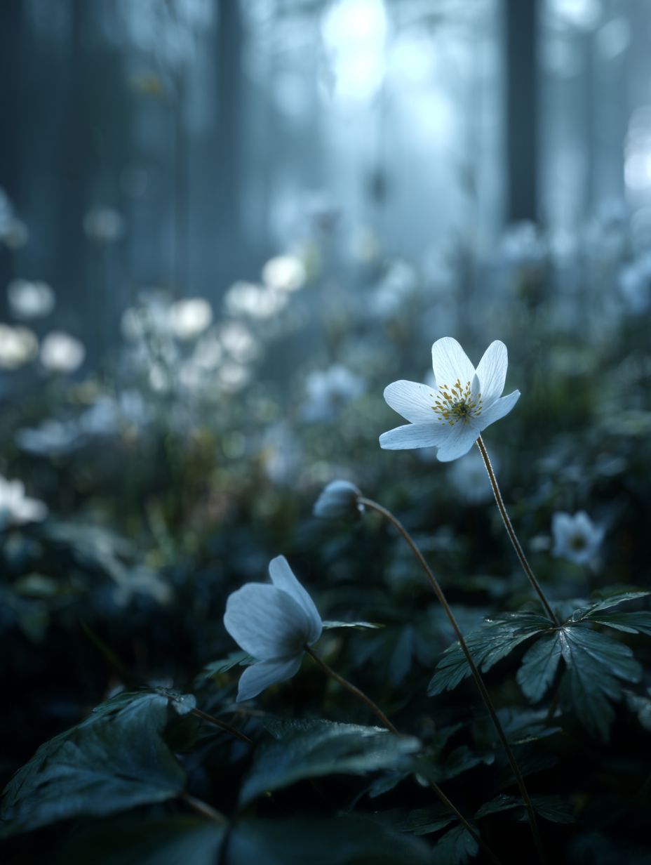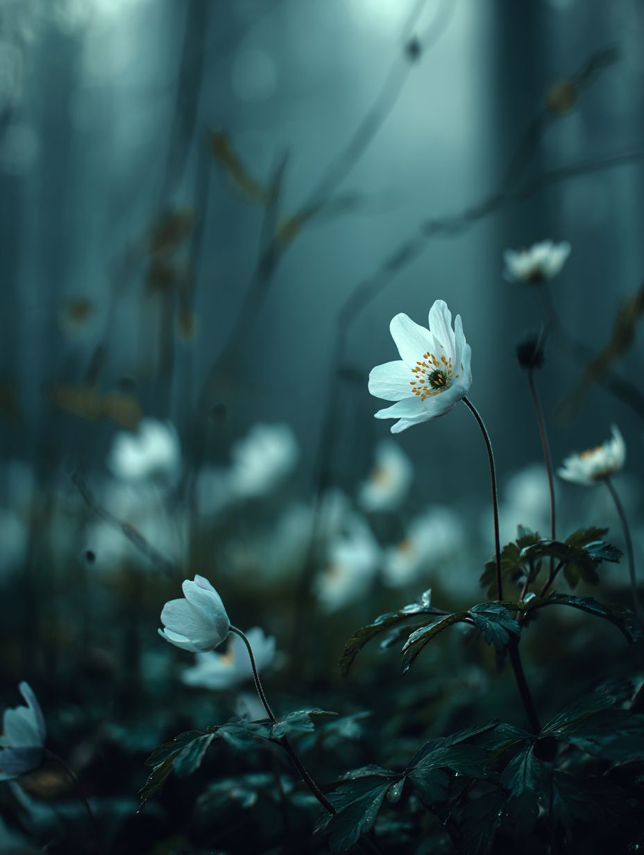 건물과 나뭇가지 사이에서 하늘을 올려다보는 저각도 시점의 사진으로, 자연에 점령당한 포스트 아포칼립스 도시를 표현합니다. 새들이 무성한 건물과 강 근처에서 겁을 먹고 날고 있습니다. 자연광에서 니콘 D850과 저각 렌즈를 사용하여 촬영하였으며, 깊이를 가진 구성입니다. 이 장면은 영화적인 연출을 가지고 있으며, 슬로우 모션 동력학과 현실적인 렌즈 플레어 효과가 특징입니다.