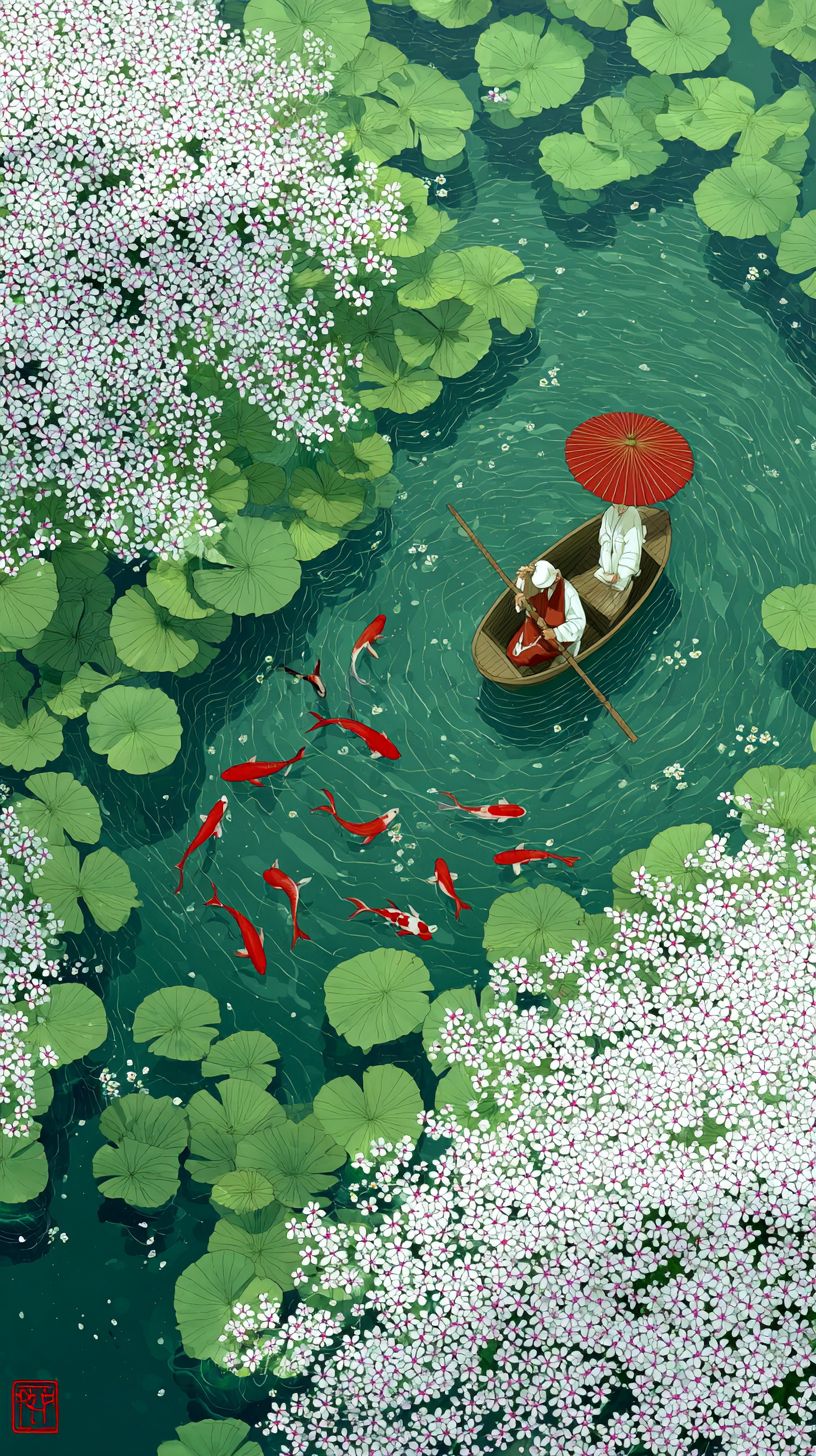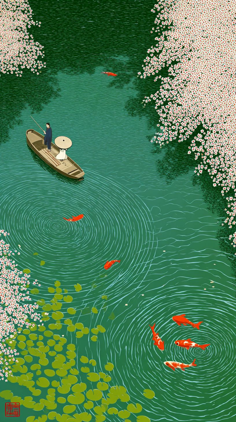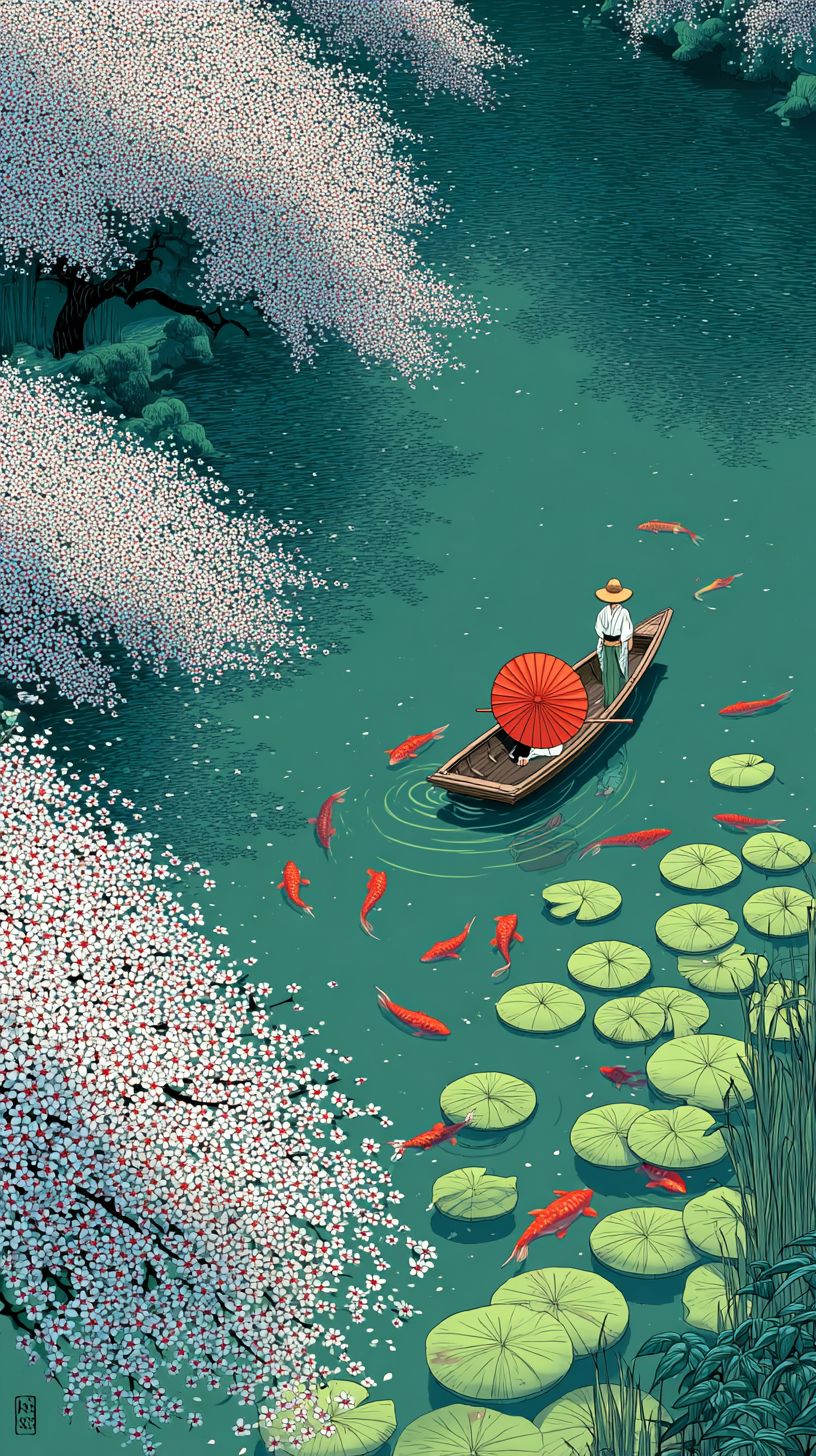 Download de papel de parede para celular :Uma ilustração de um lago tranquilo cercado por flores de cerejeira, cujas pétalas flutuam na água. Koi vermelhos nadam sob as folhas de lírio, criando suaves ondulações. Um casal em um barco a remos flutua, um segurando um guarda-sol. No estilo de Katsushika Hokusai, a obra mistura natureza e graça humana.