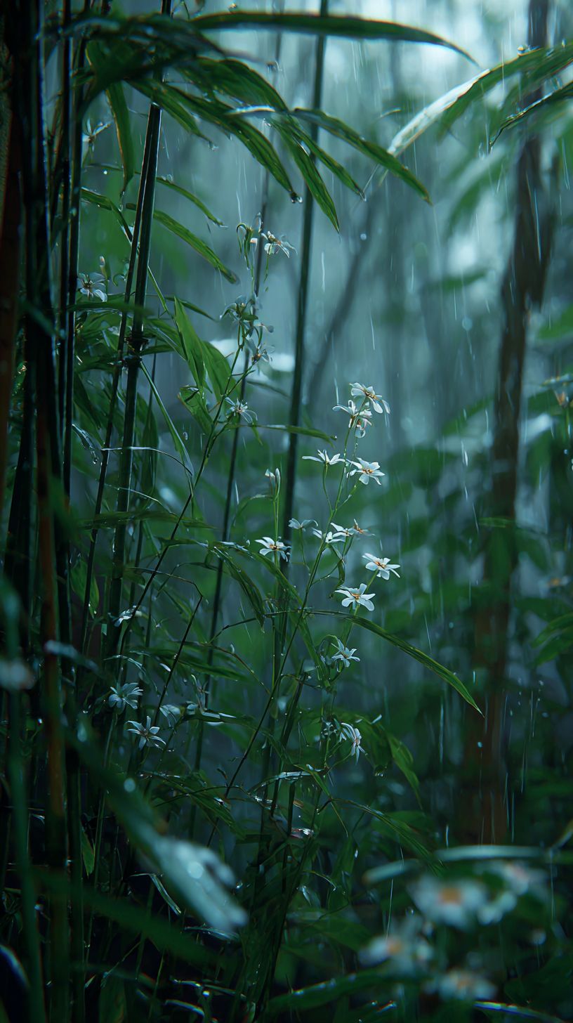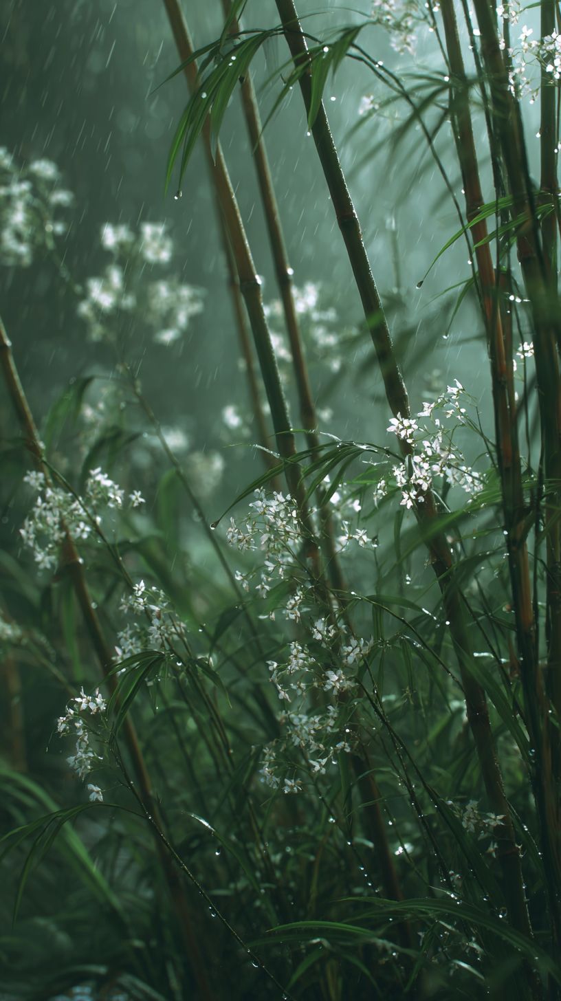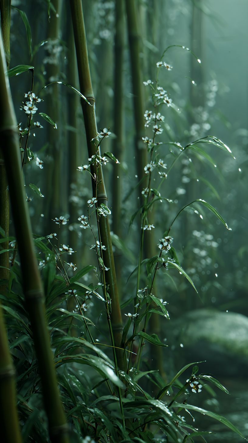 Download de papel de parede para celular :Um bosque de bambu com hastes verdes finas balançando, pequenas flores brancas aninhadas nas folhas, ar neblinoso com gotículas de água fracas, som distante de um riacho borbulhante, profundidade cinematográfica, tranquilo e exuberante.
